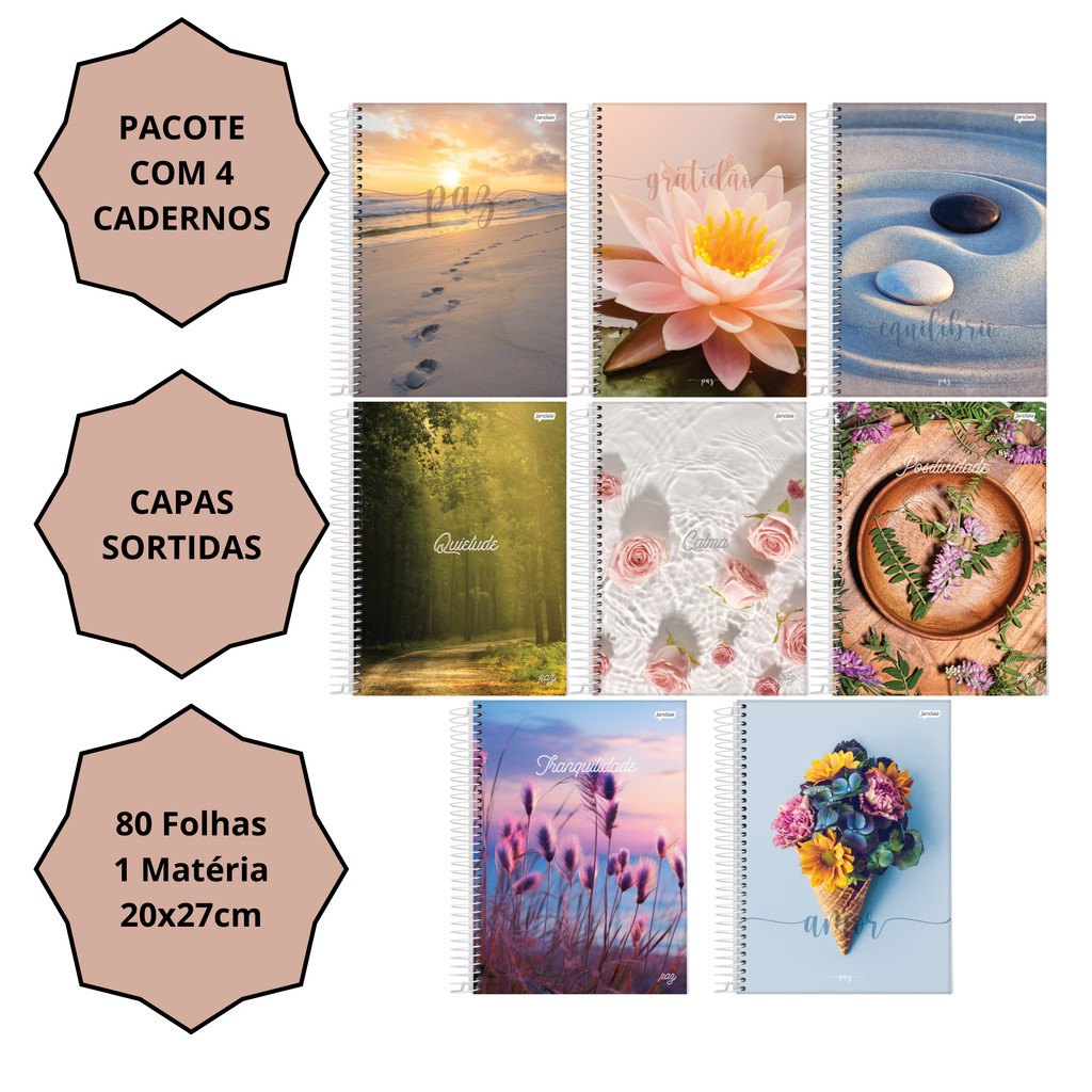 Caderno Universitário Capa Dura 1 Matéria 80 Folhas Paz Jandaia - Pacote Com 4 capas Sortidas