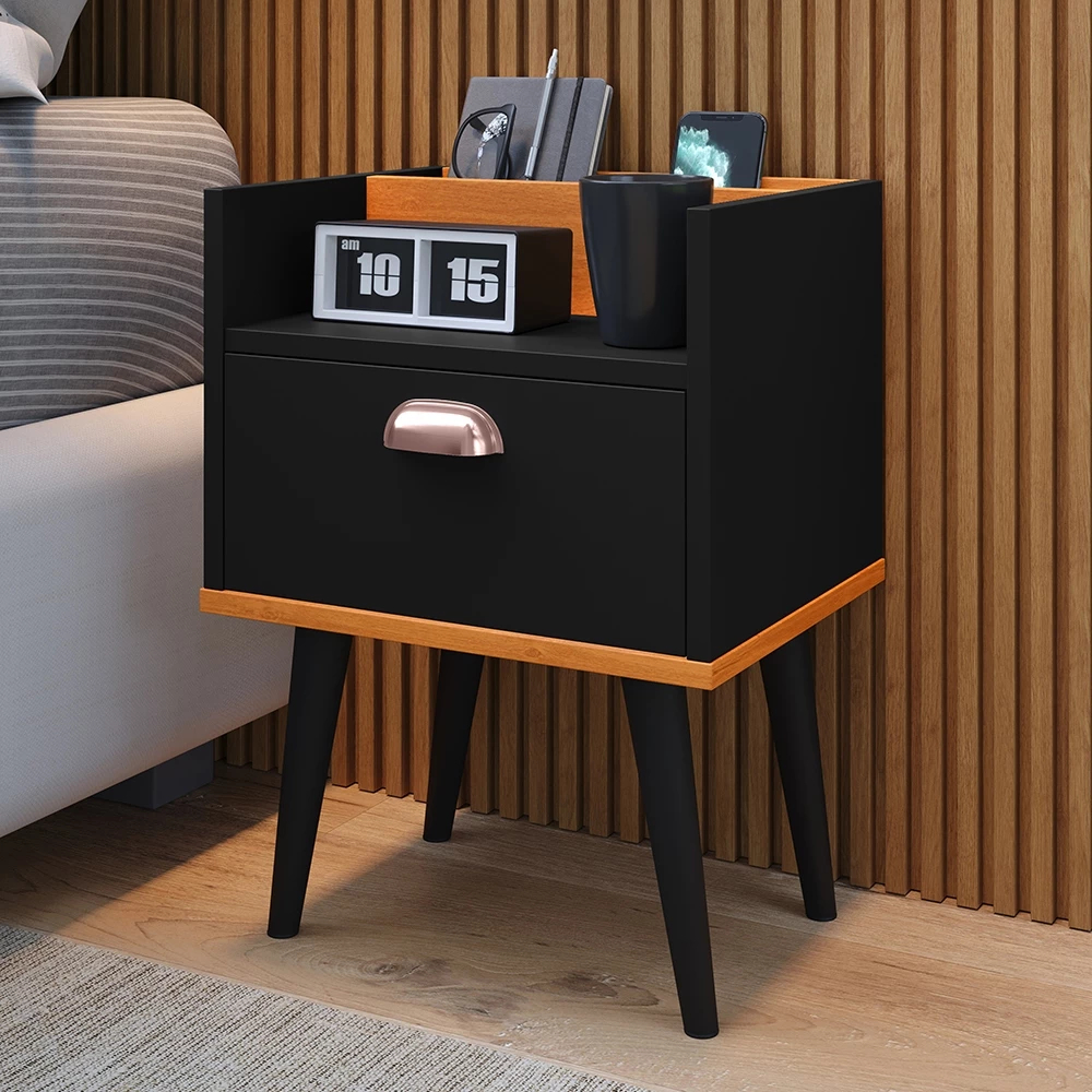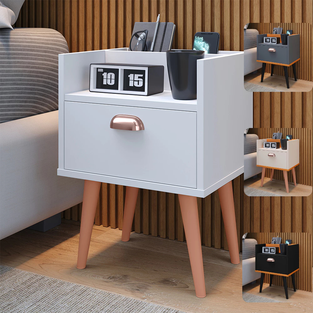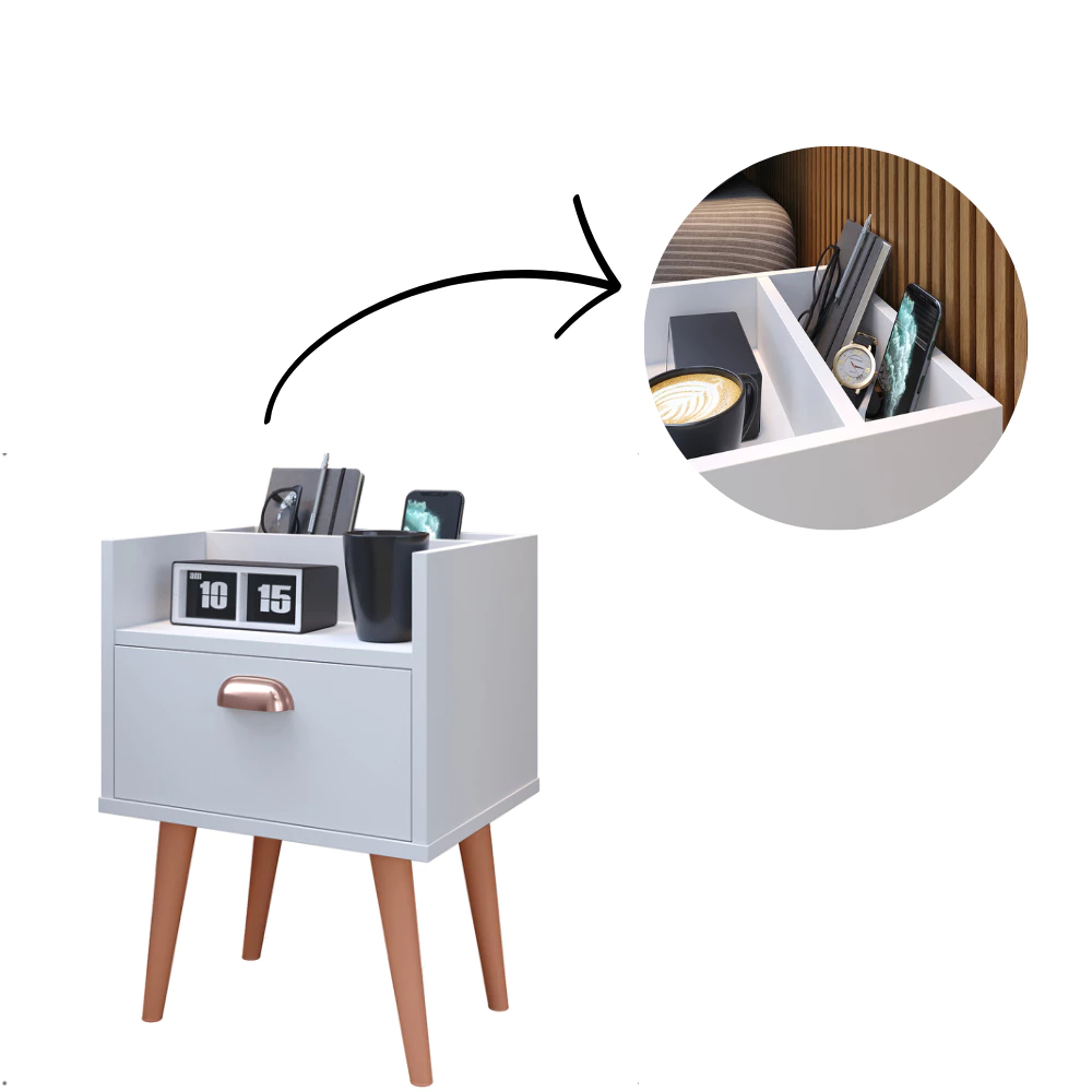 Mesa Lateral Cabeceira pequena com pés e gaveta espaçosa puxador concha porta celular criado Milena