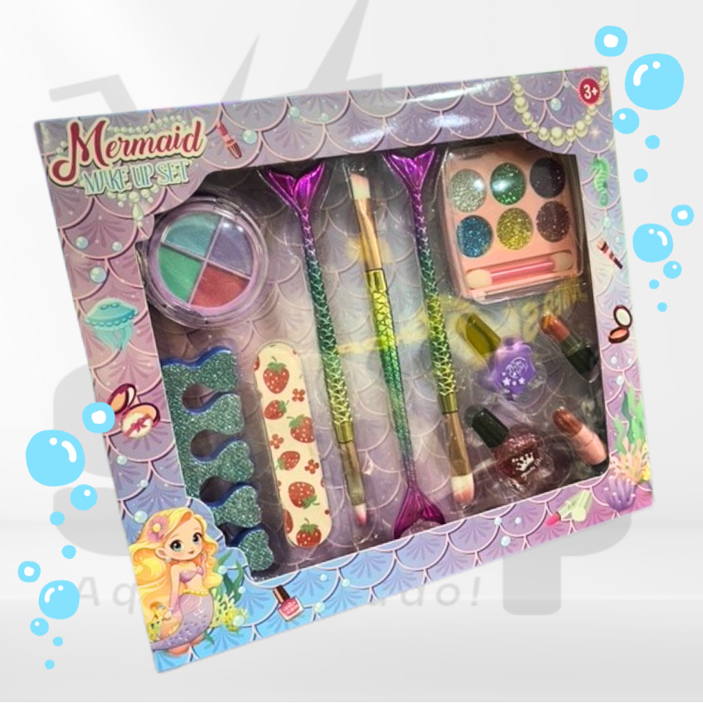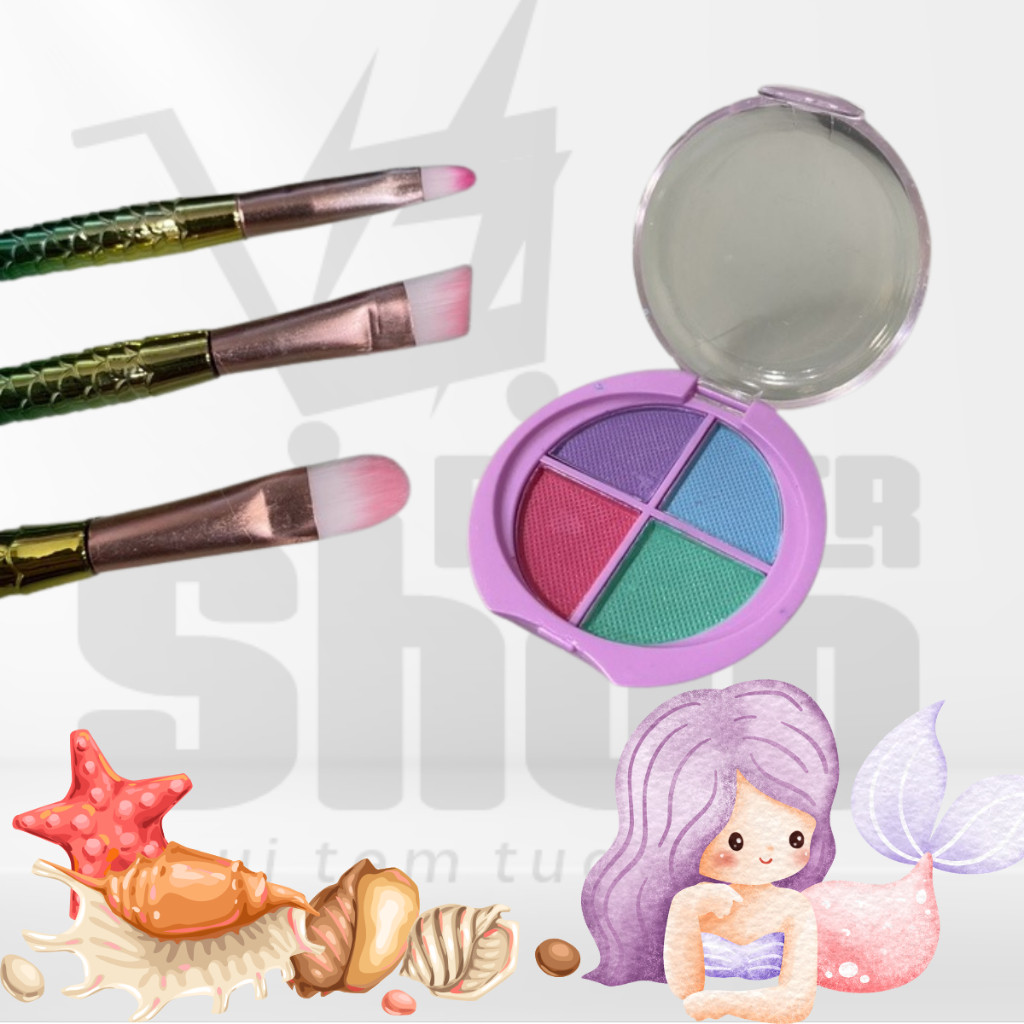 Kit de Maquiagem Sereia Infantil Completo 11 Peças – Pincéis, Sombras, Batons e Esmaltes