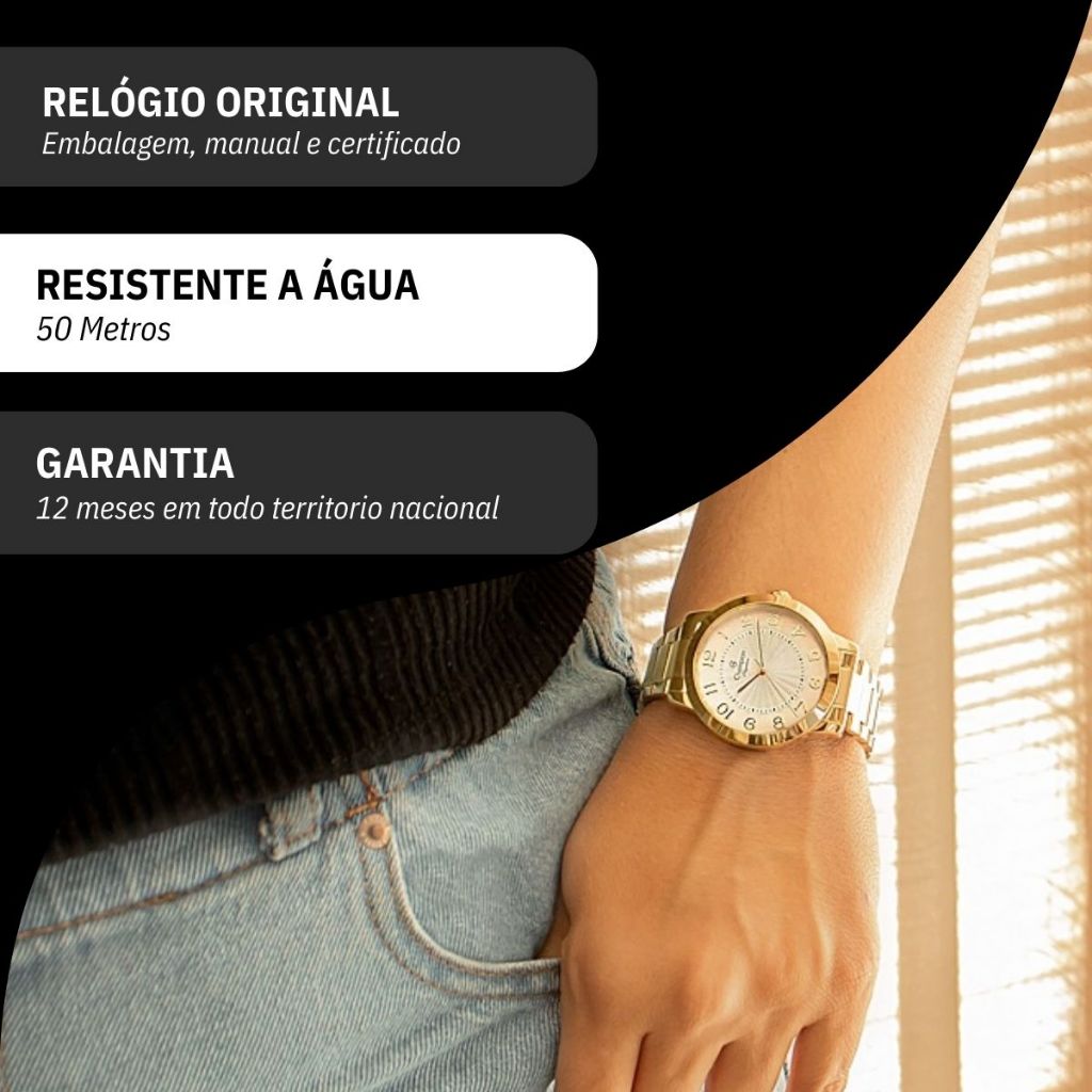 Relógio Feminino Dourado Champion Elegance Estilo Mulher Prova D Agua + Colar e Brincos CN25118W