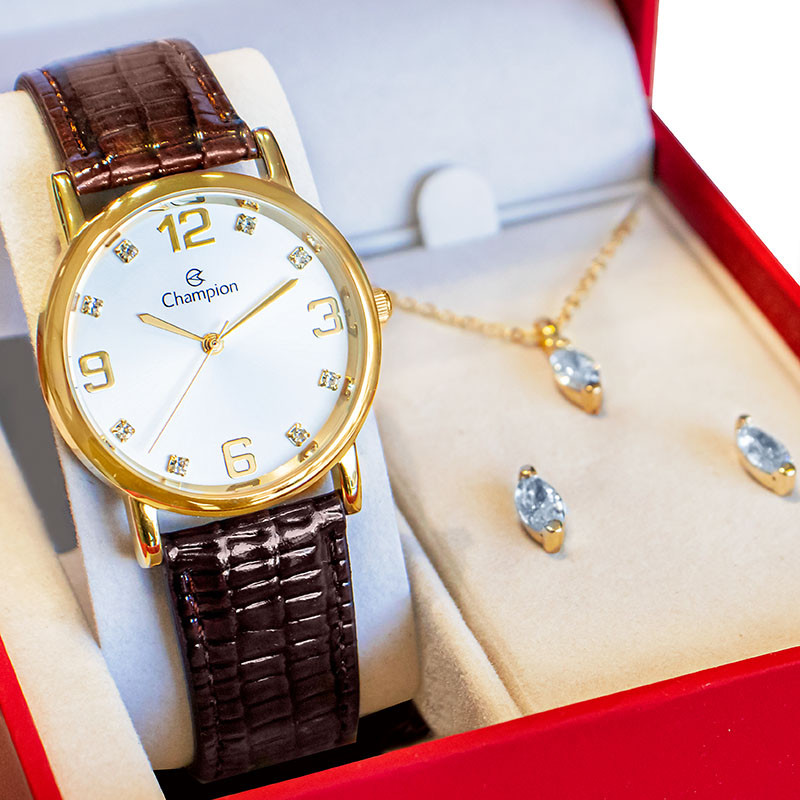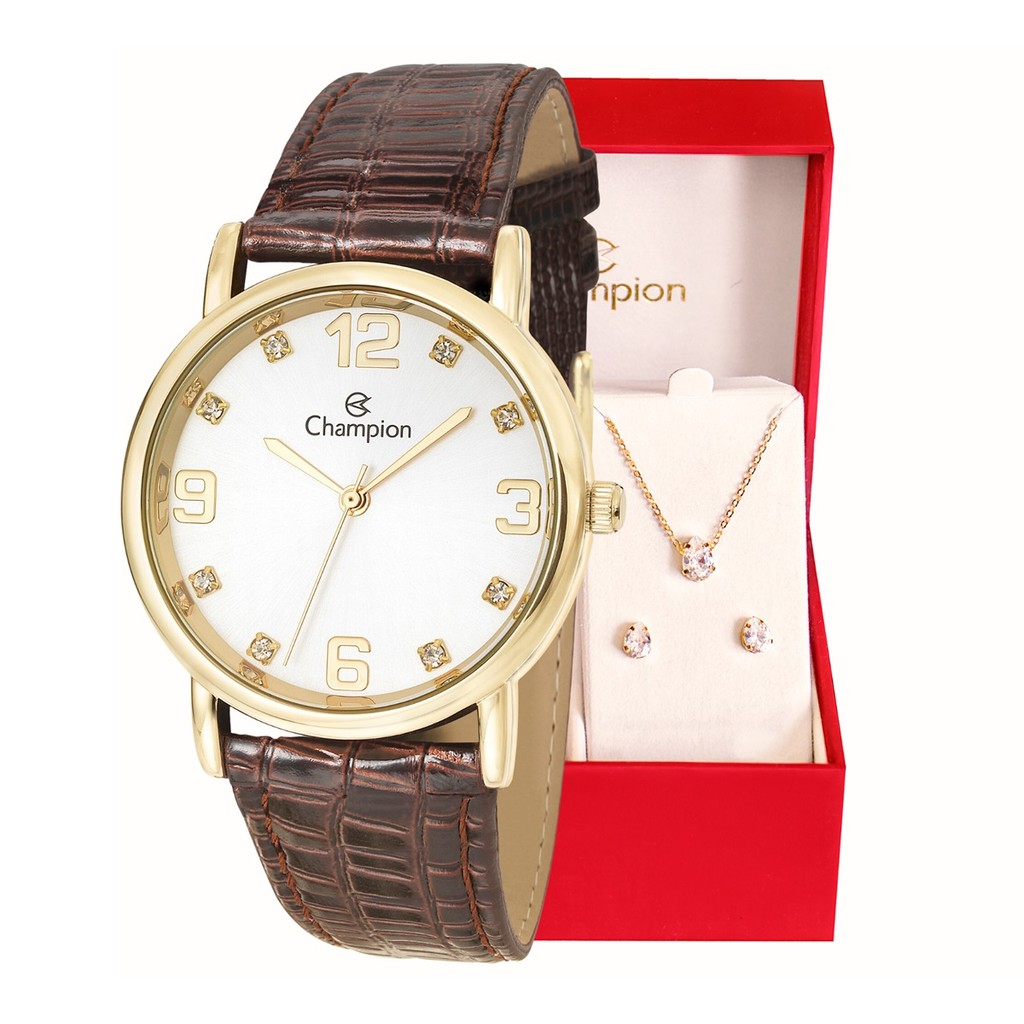 Relógio Feminino Champion Analógico Couro Marron Kit Colar e Brincos CN20186B