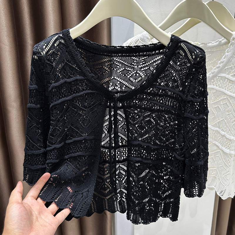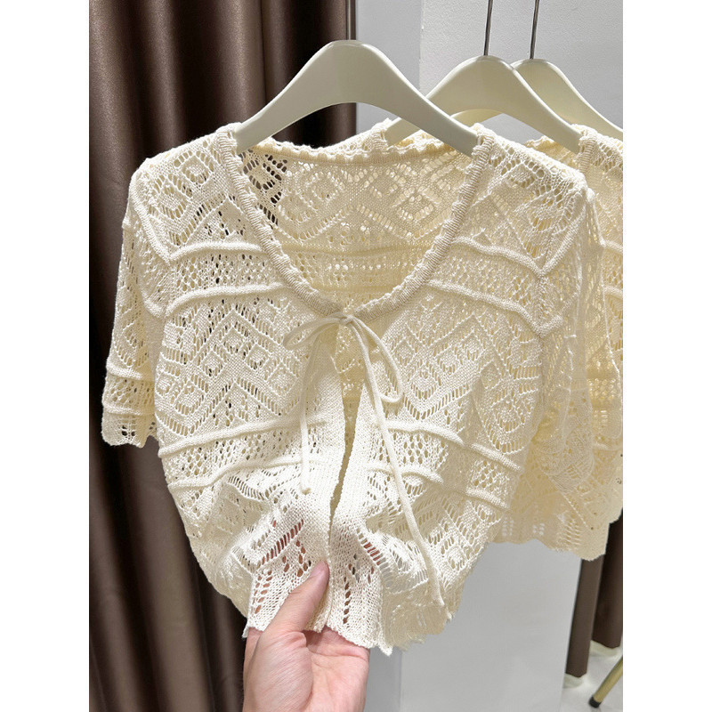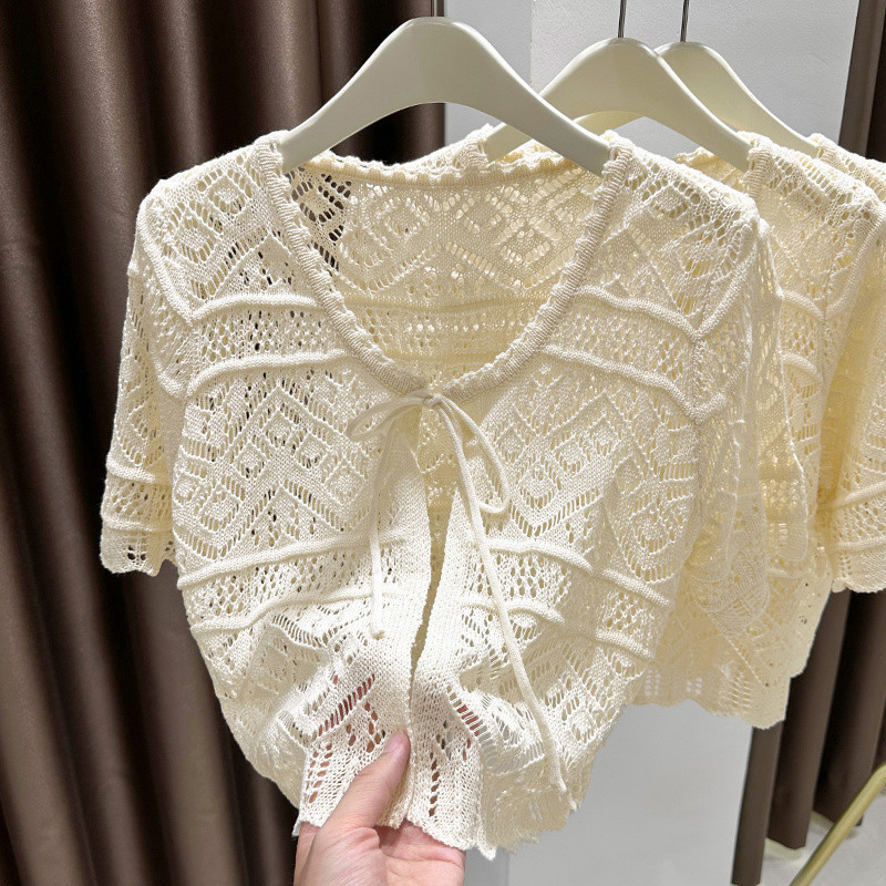 Blazer Feminino Estilo Coreano de Verão Branco Preto Manga Curta Bolero de Renda Encolhível Cardigan ao Ar Livre OC6A