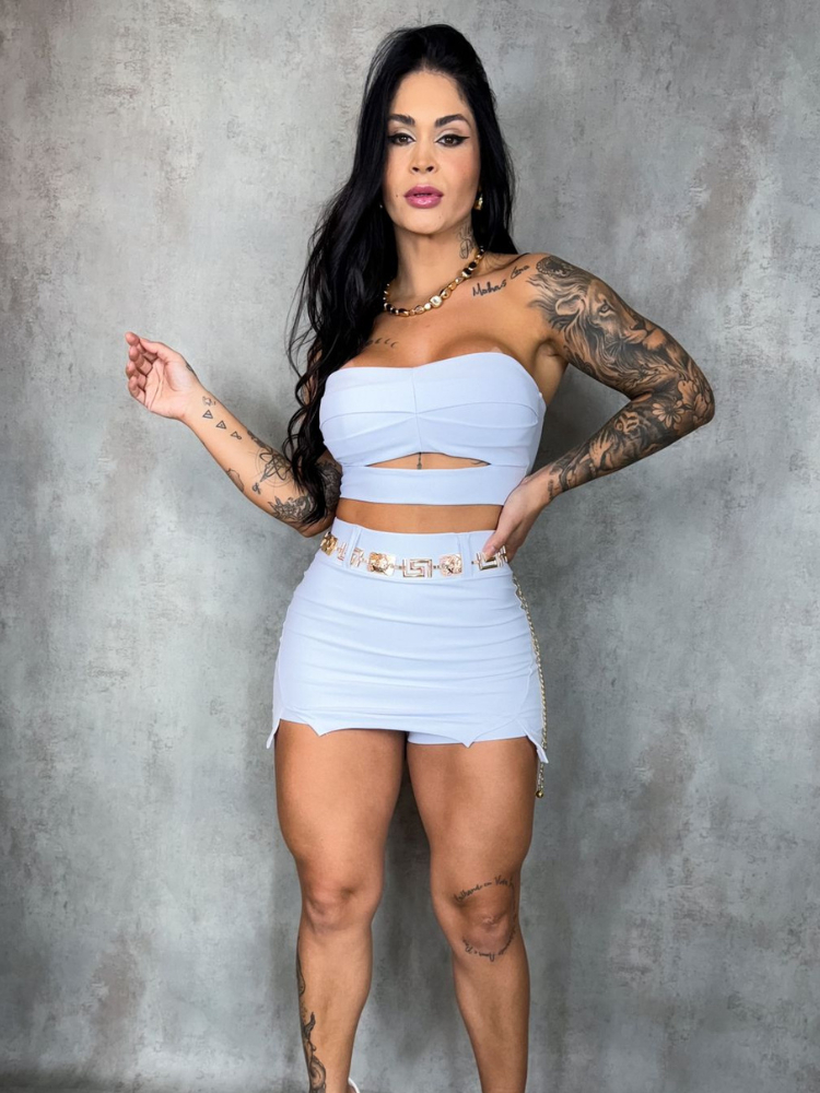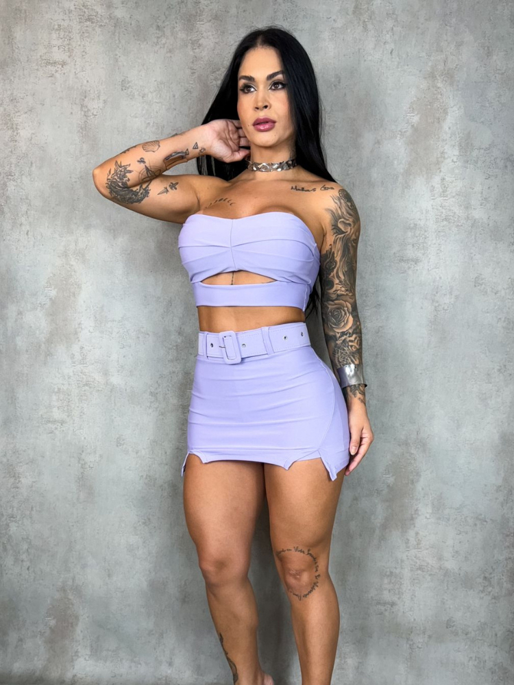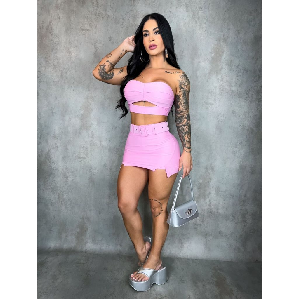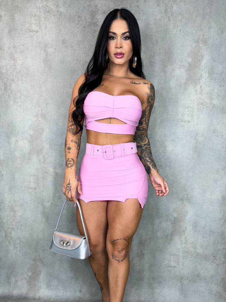 Conjunto Femenina Shorts Saia e Cropped /Top Tomara que Cai com Bojo + Cinto – Moda Feminina
