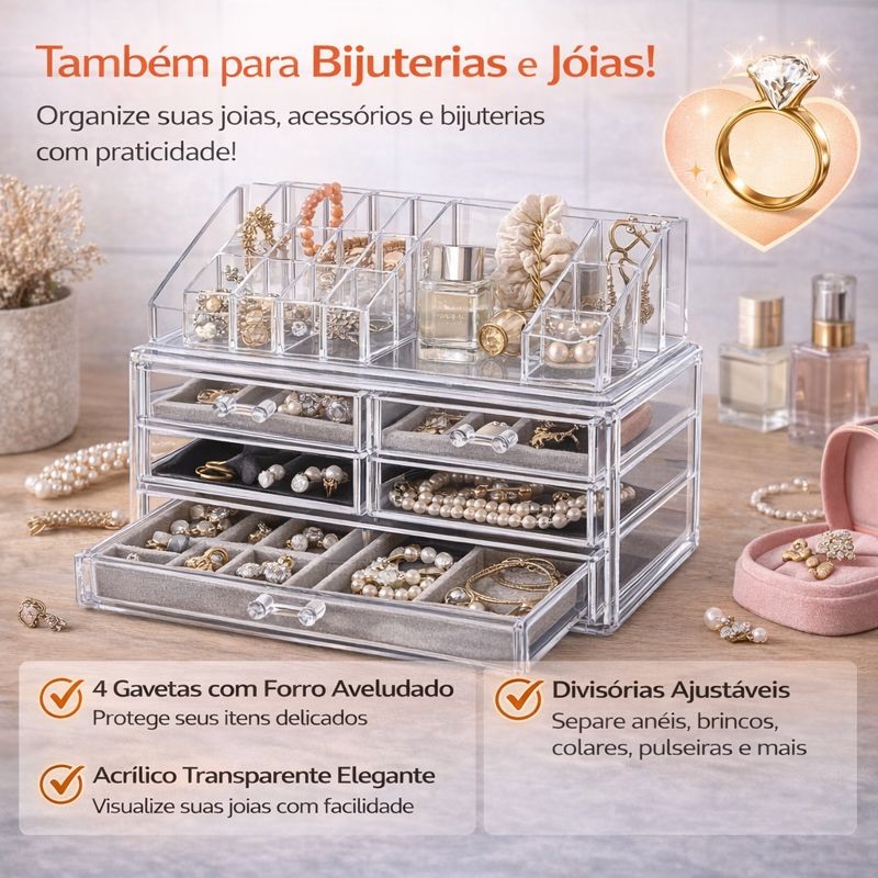Organizador de Maquiagem Acrílico Transparente com Gavetas Altas Porta Cosméticos e Porta Joias