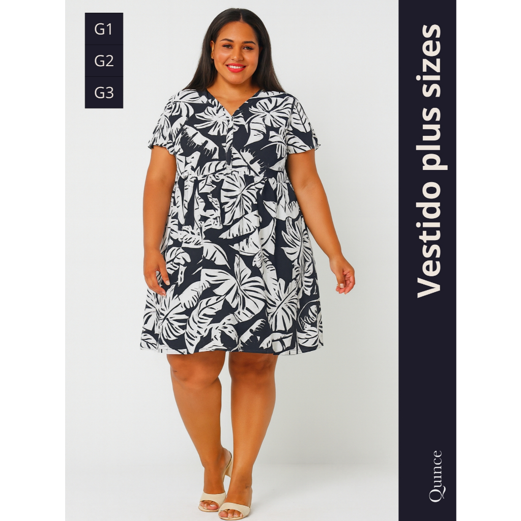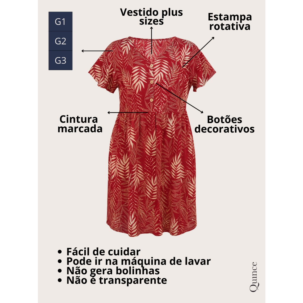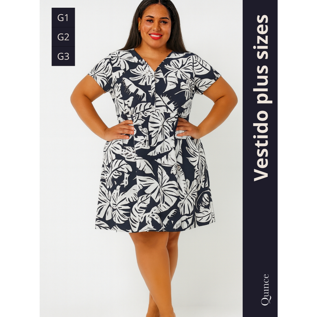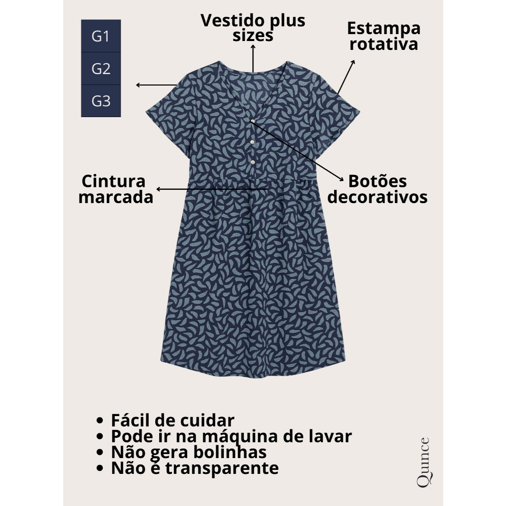 Vestido plus crepe estampado 3 botões franzido manga evasê fresquinho