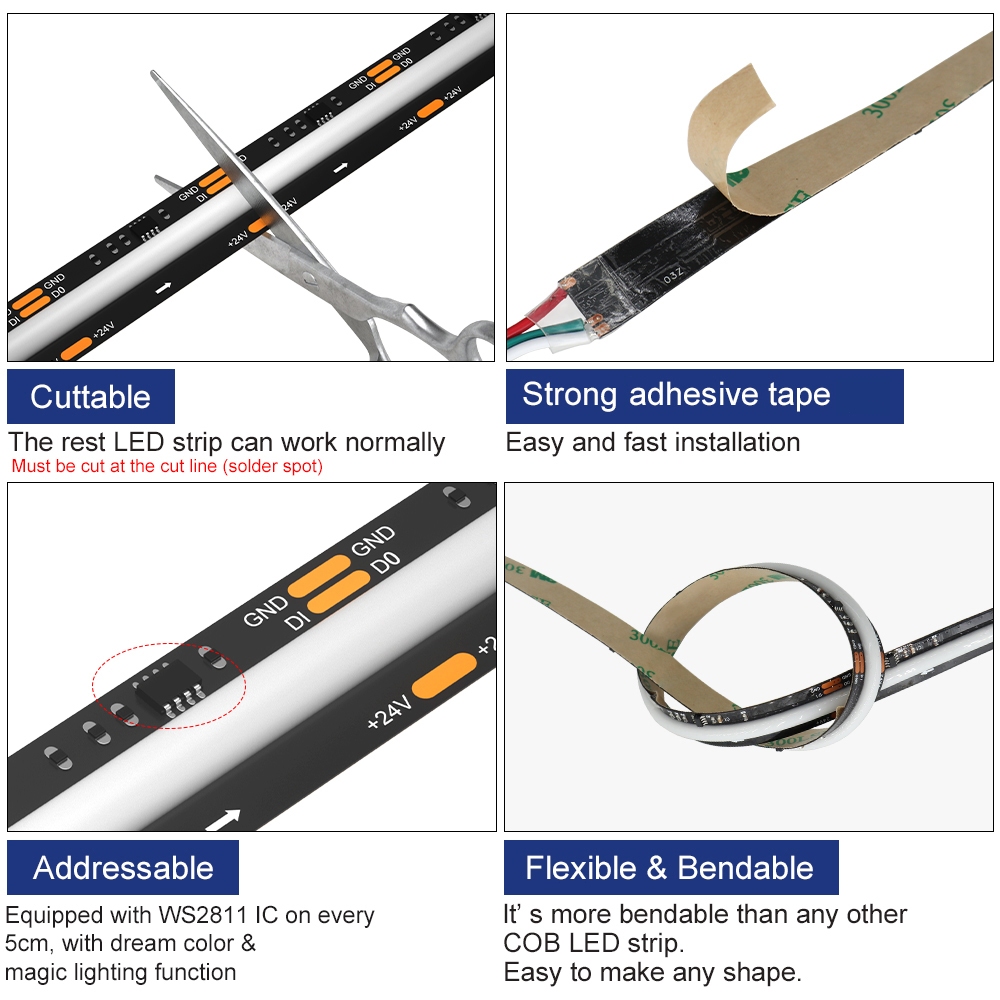 16 Milhões De Cores 5m COB RGBIC LED Strip 5V/12V/24V Cortável Para Festas Quarto Accent Wall