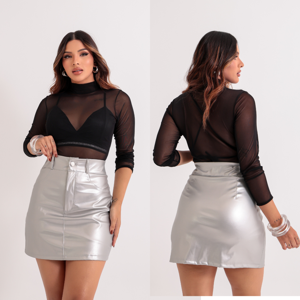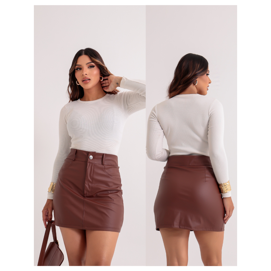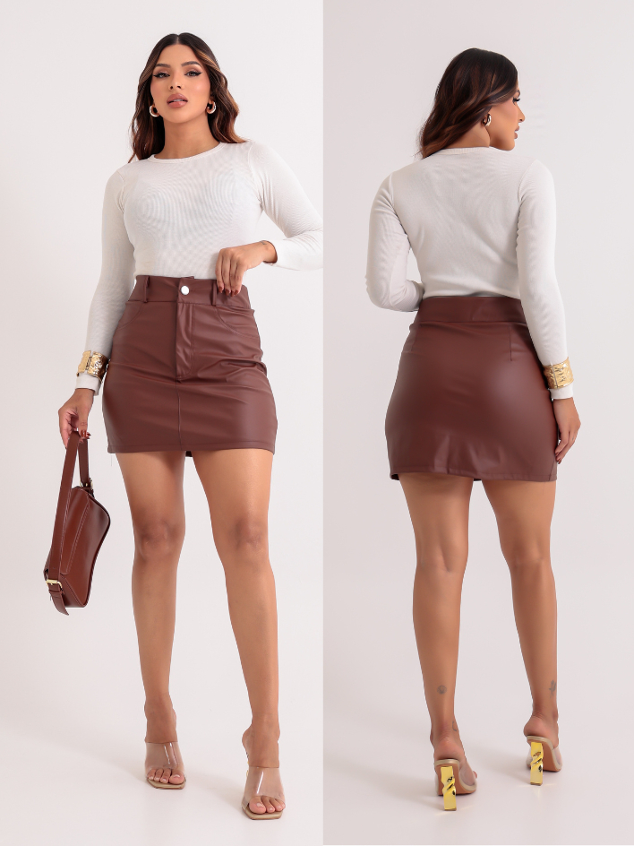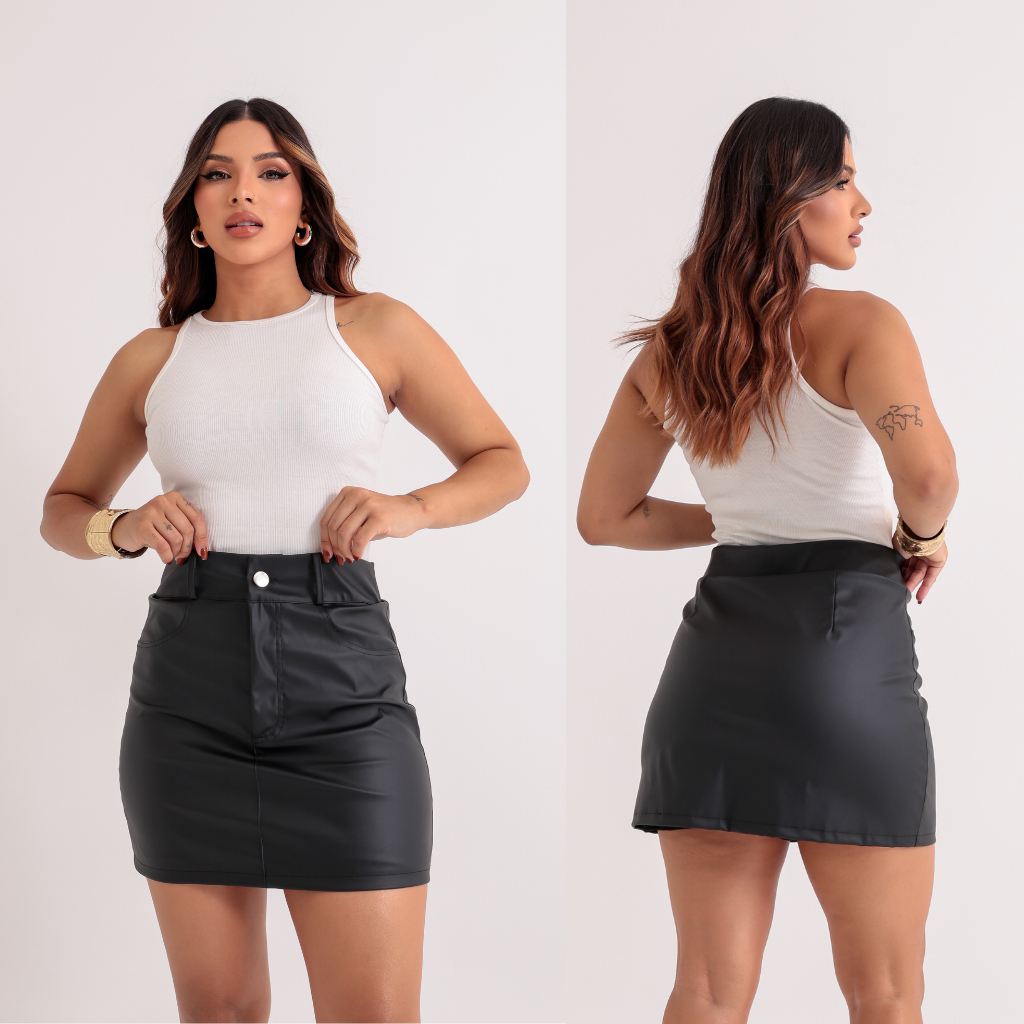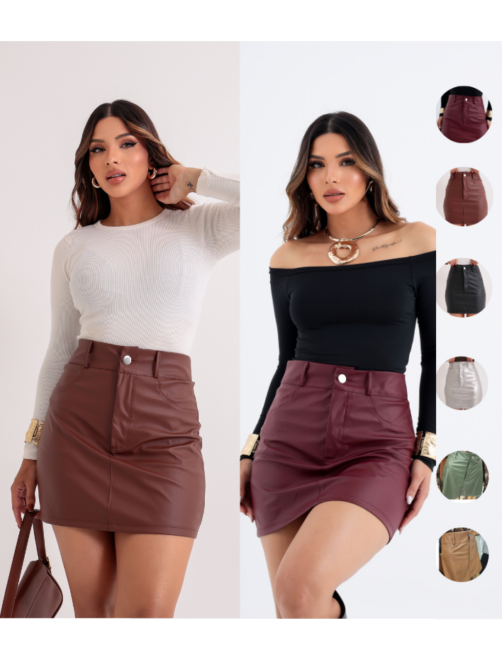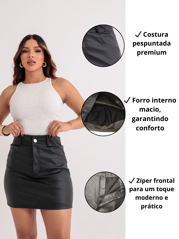 Saia Couro Fake Feminino Luxo Elegante - Cintura Alta Zíper E Forro