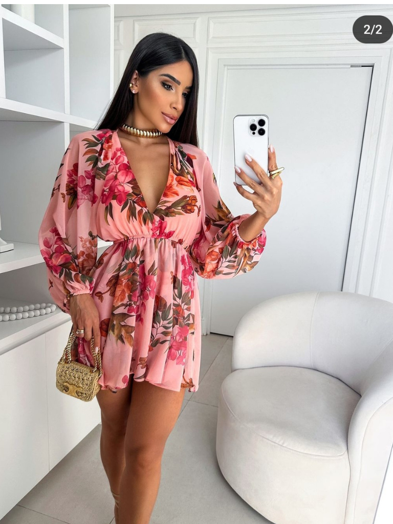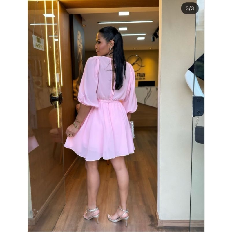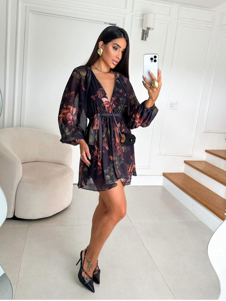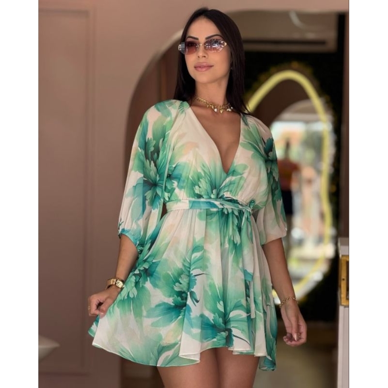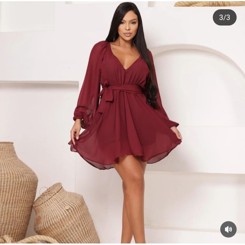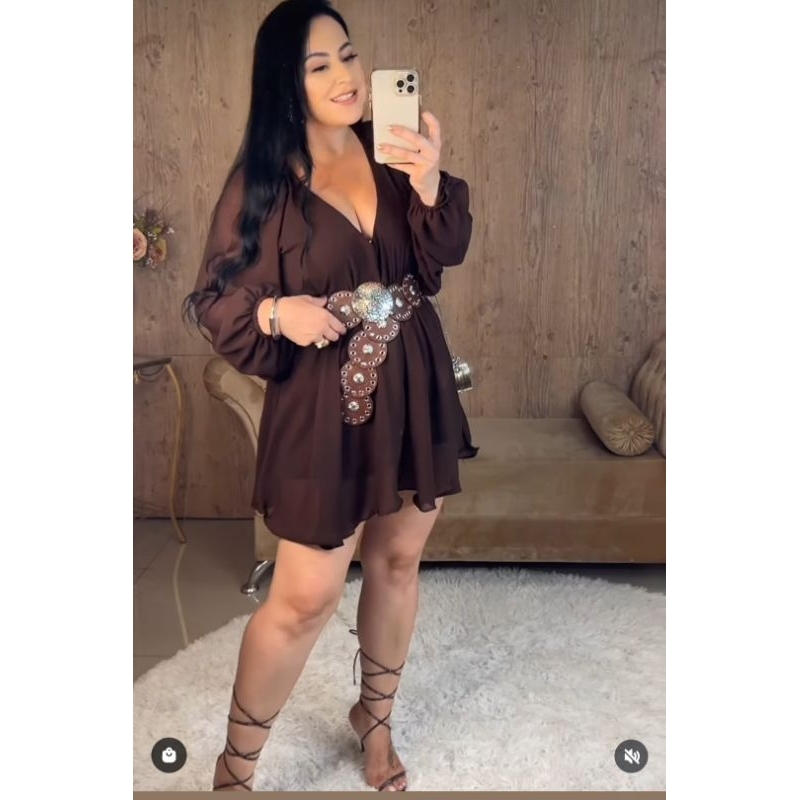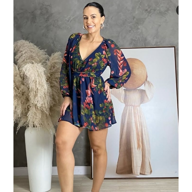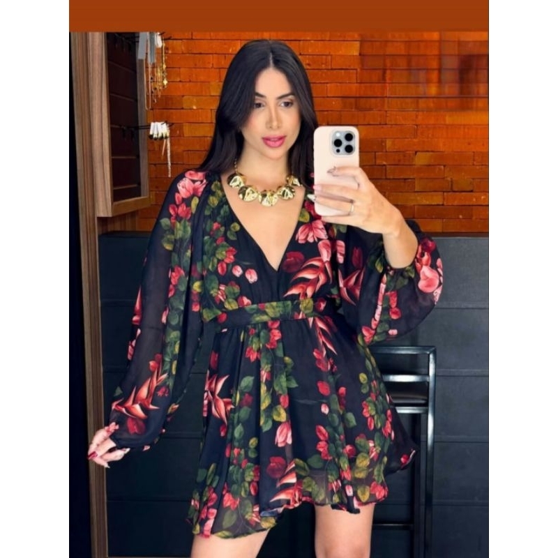 Vestido macaquinho feminino Boho chic chiffon soltinho manga buffant outono inverno verão