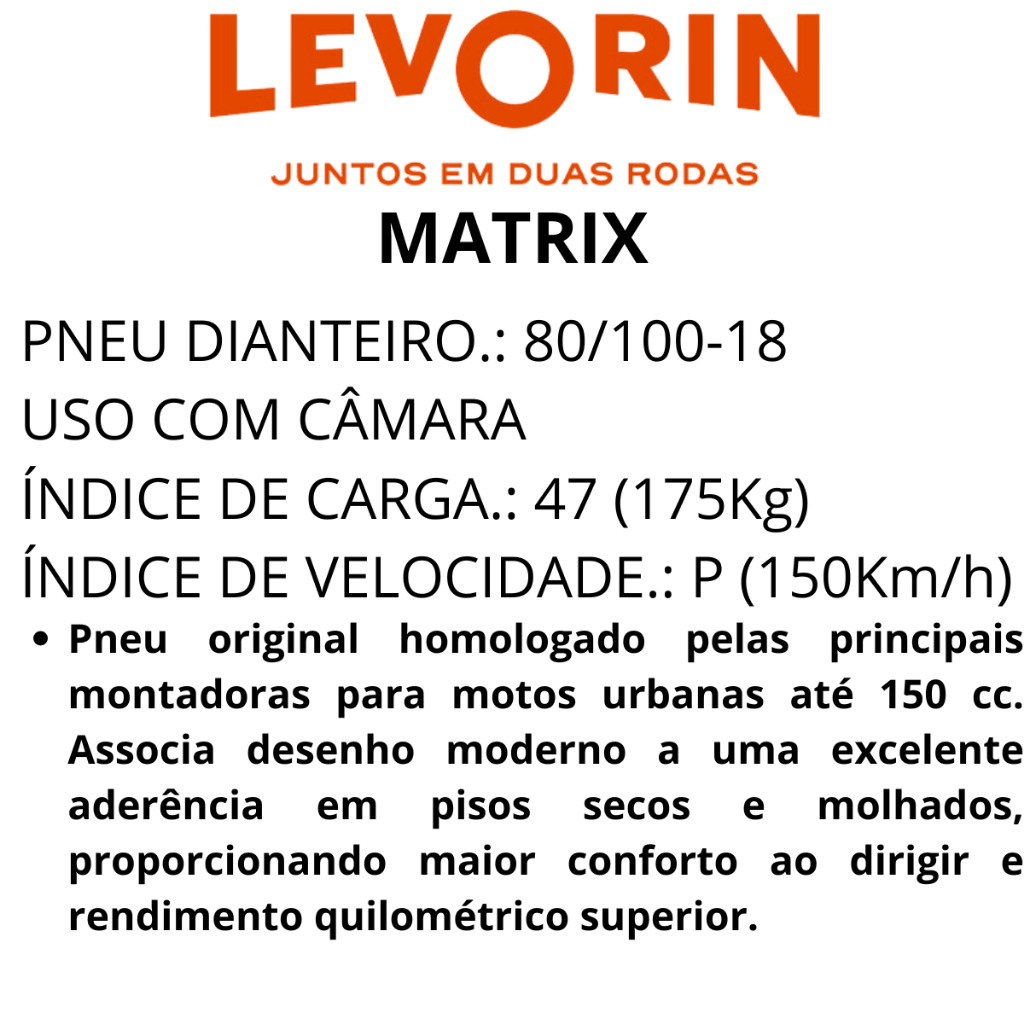 Pneu Dianteiro 80/100R18 47p Levorin Matrix Moto CG 125/150/160 Cargo Fun Star Start e Titan