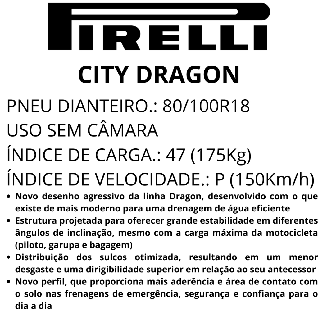 Pneu Dianteiro 80/100-18 47p Pirelli City Dragon Moto