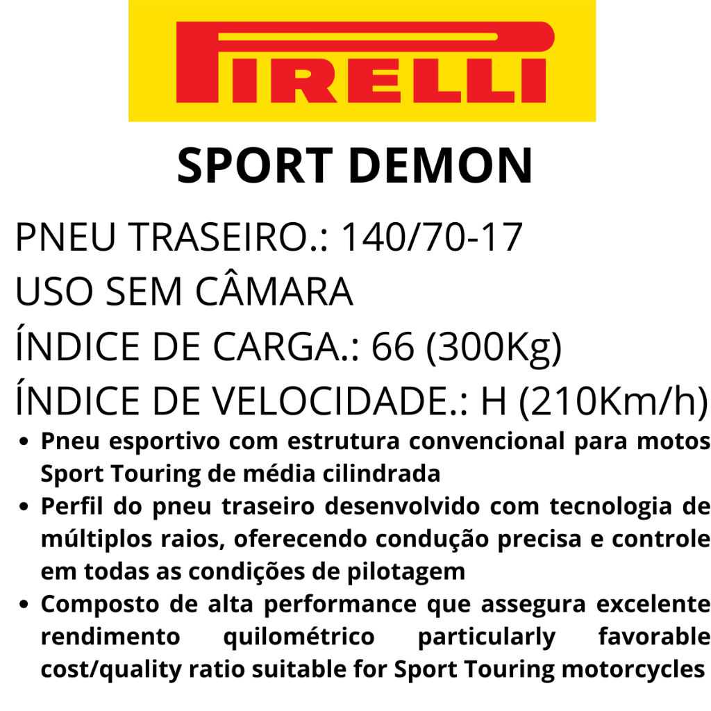 Pneu Moto 140/70R17 Traseiro Pirelli Sport Demon Uso Sem Câmara