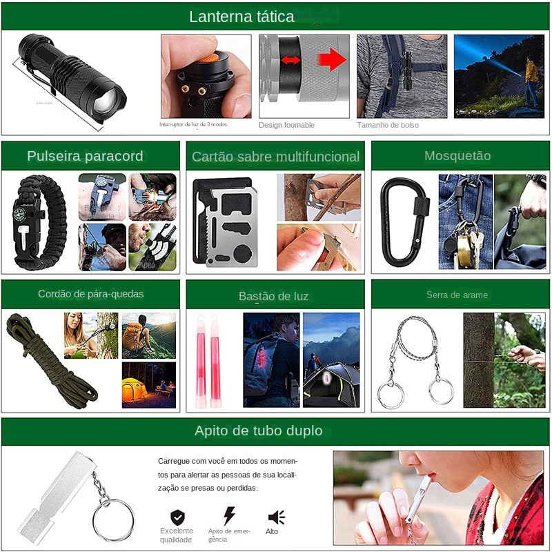 Mochila de Emergência 29 itens Kit sobrevivência EDC Primeiros Socorros Militar Acampamento Tático Camping Acampamento.