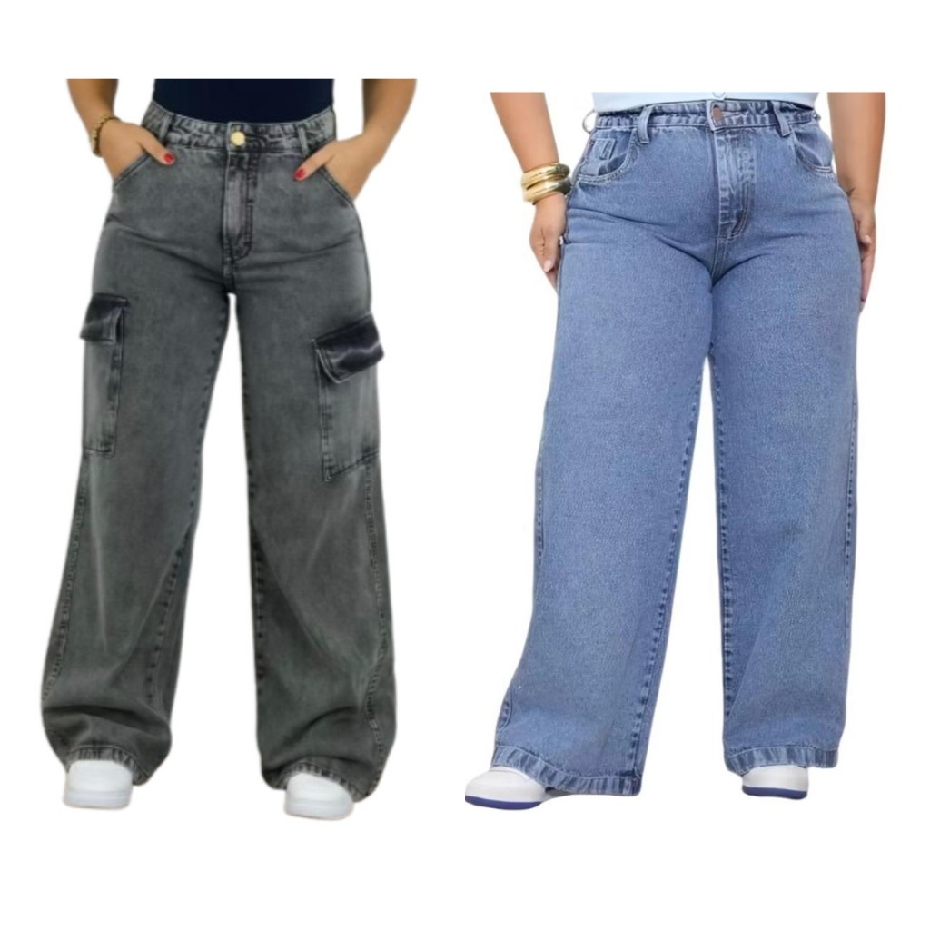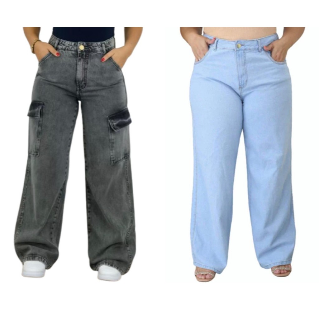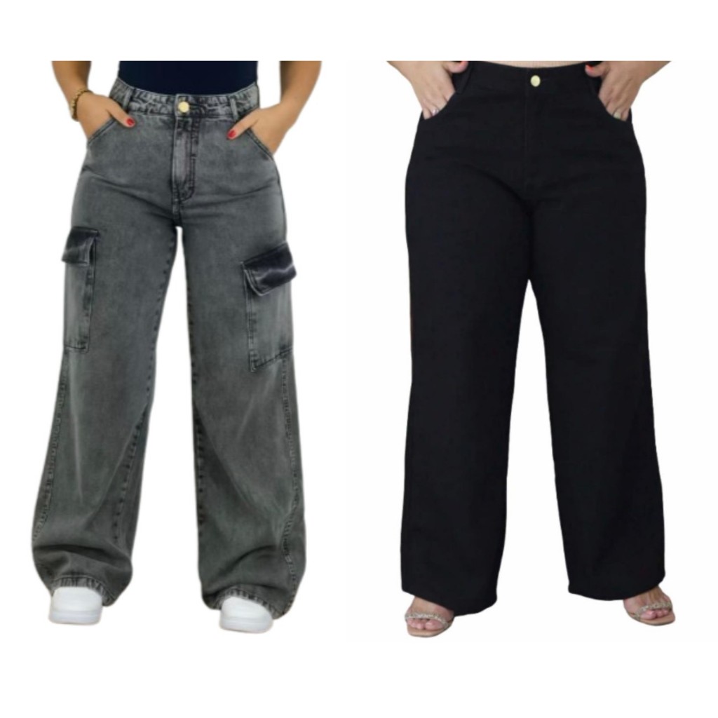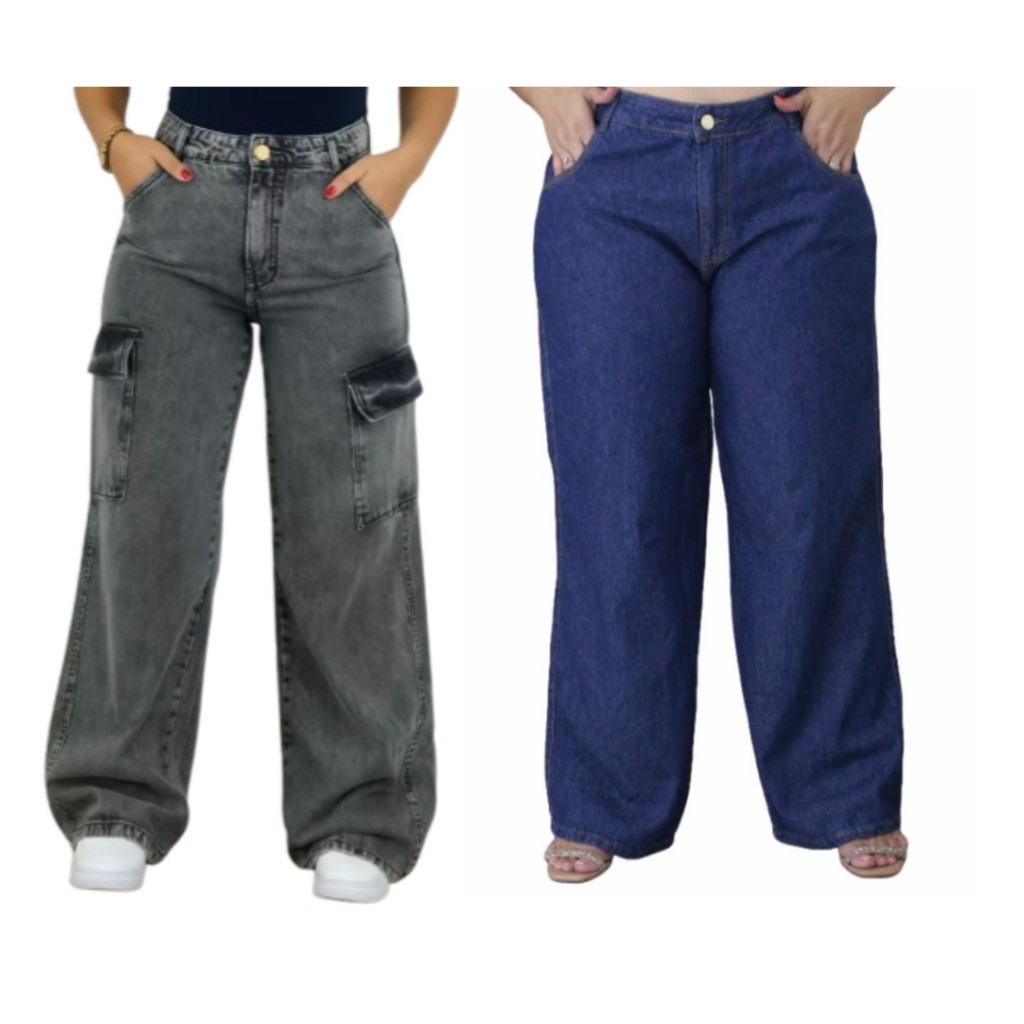 KIT 2 calças jeans cargo Grafite e Wide leg plus size 100% algodão 46 ao 54