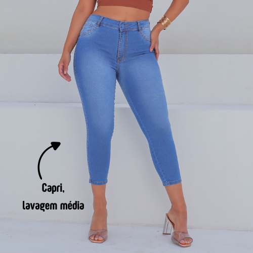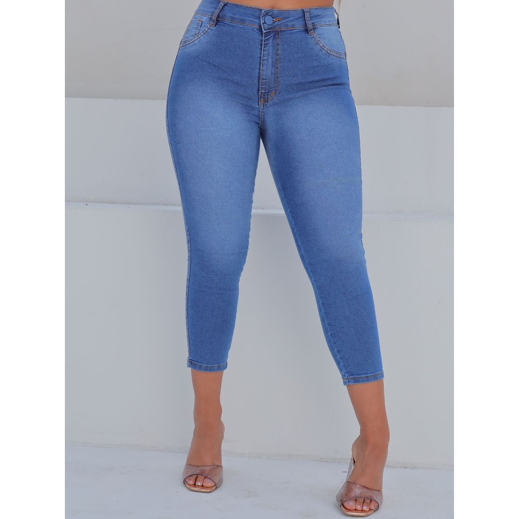Calça Capri Jeans Curta Cintura alta modela bumbum elastano/lycra com botão jeans