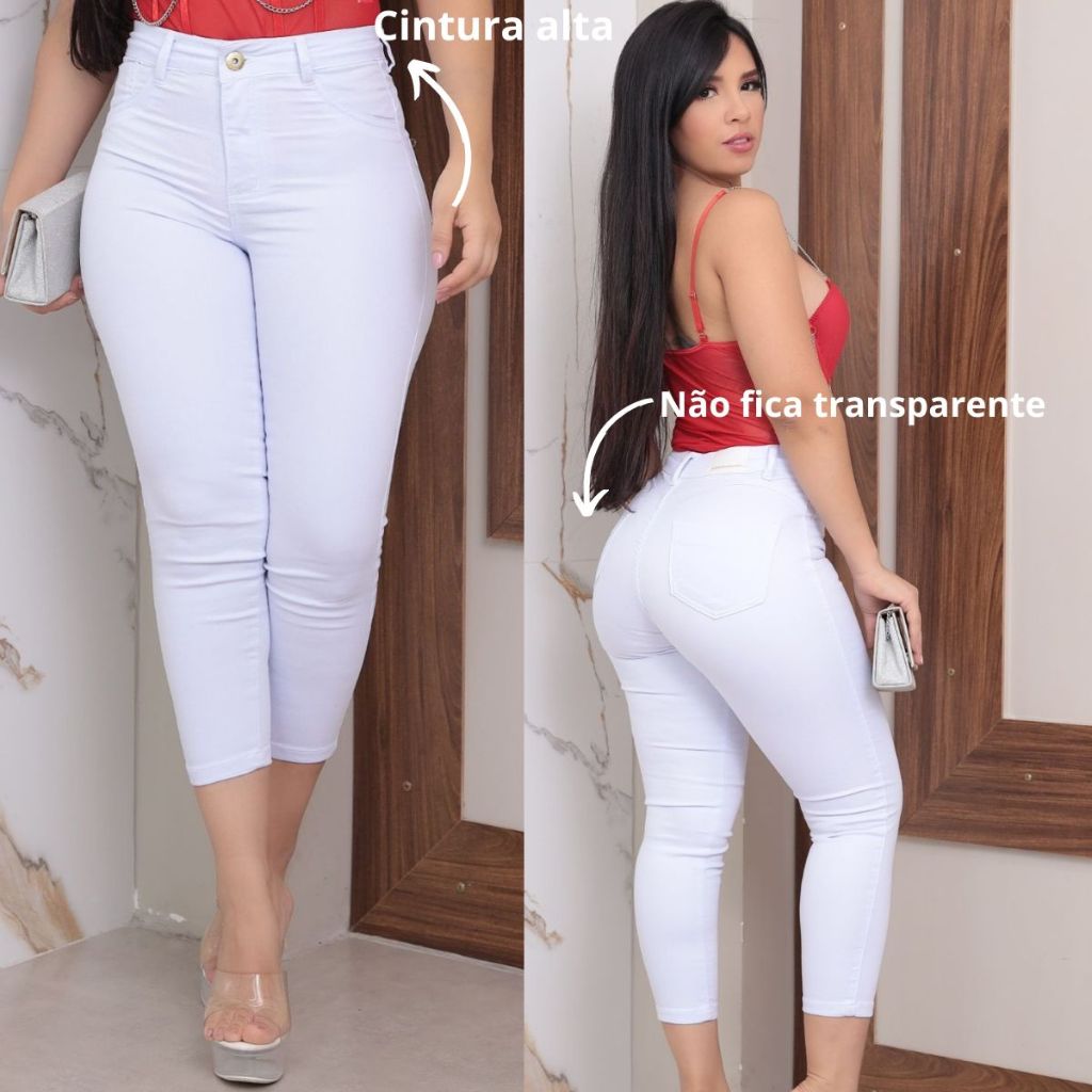 Calça Capri curta branca feminina jeans com lycra cintura alta moda tendência lançamento