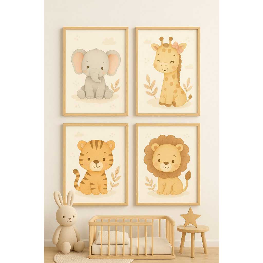 QUADRO DECORATIVO 4 PEÇAS AQUARELA ANIMAIS SAFARI