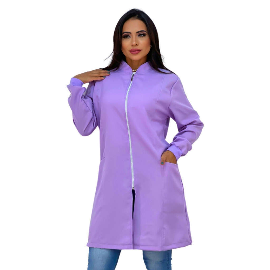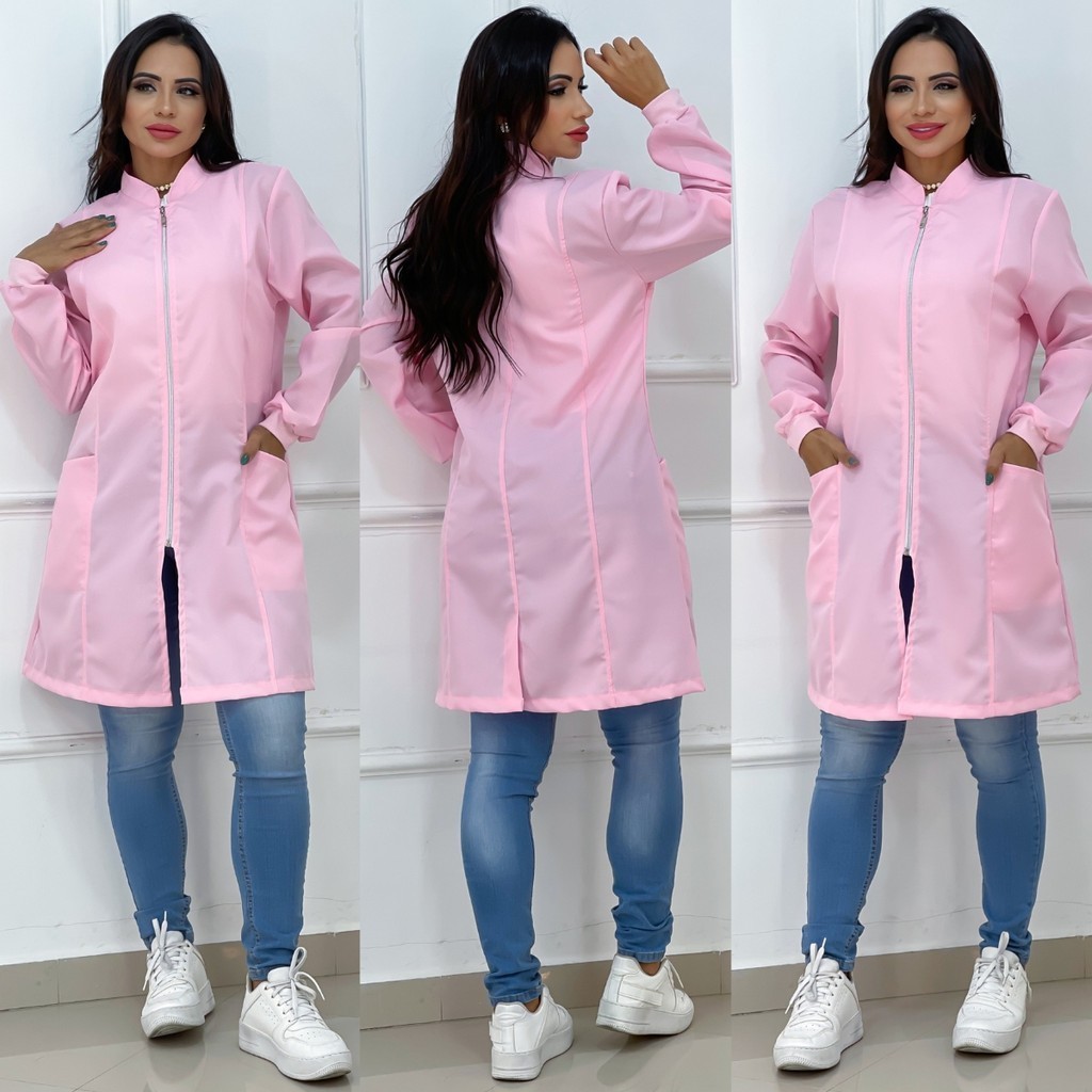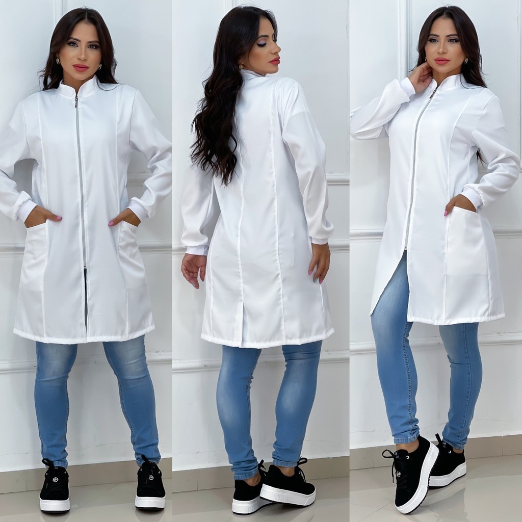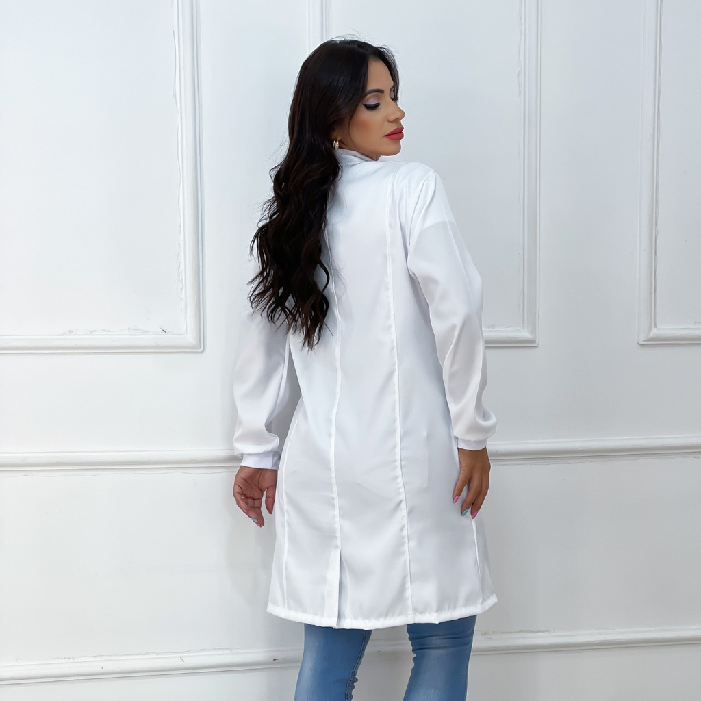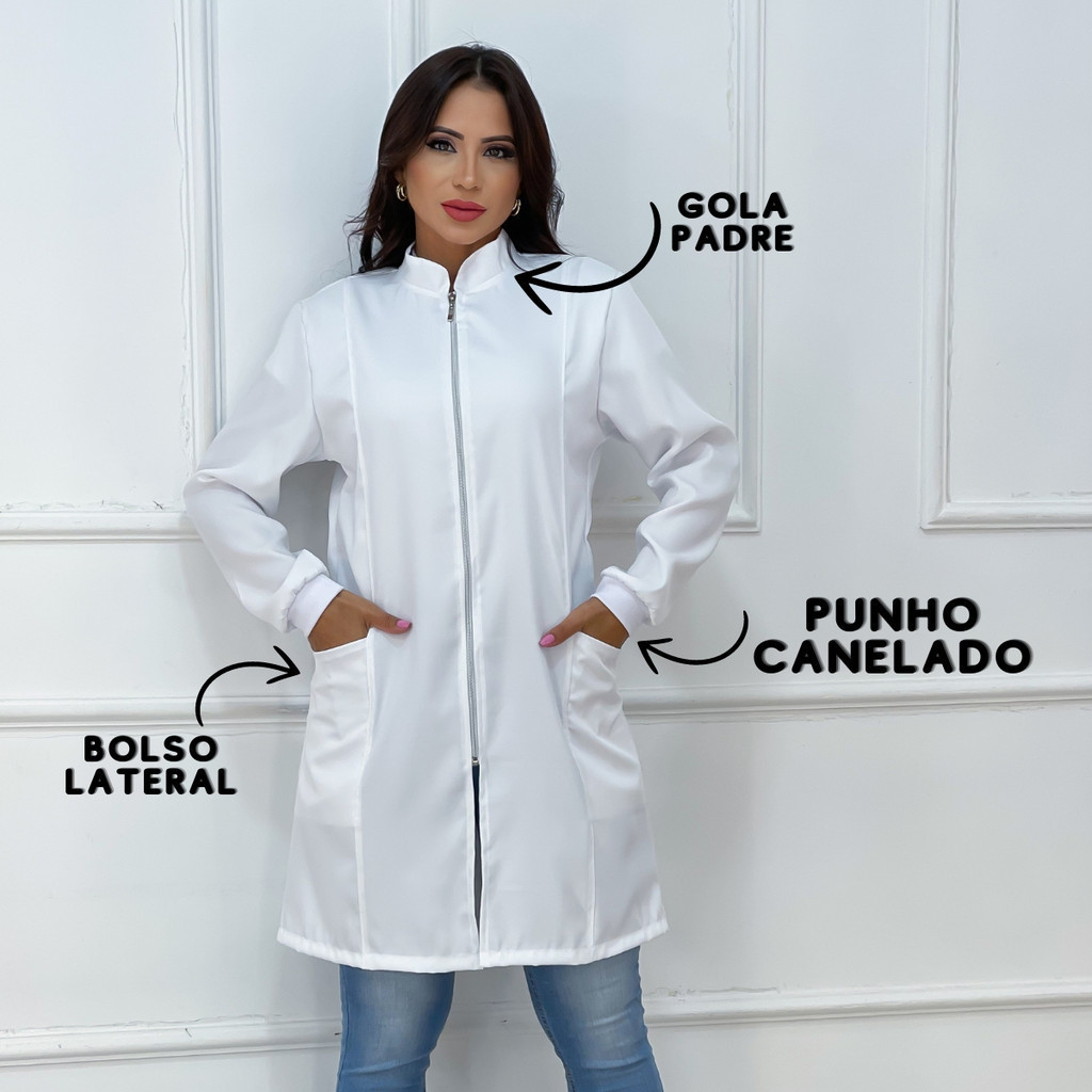 Jaleco Feminino Com Zíper Gola Padre Caimento Acinturado Manga Longa Bolso Lateral Tecido Premium