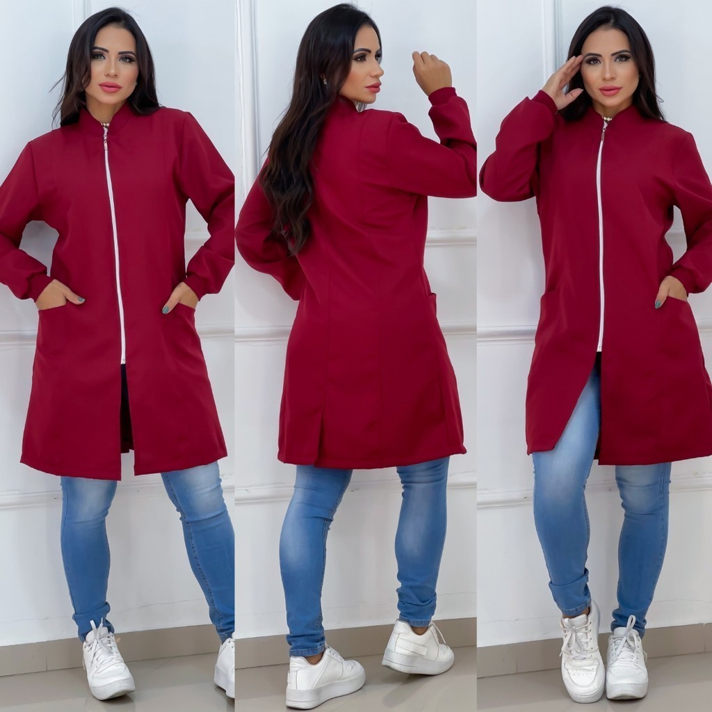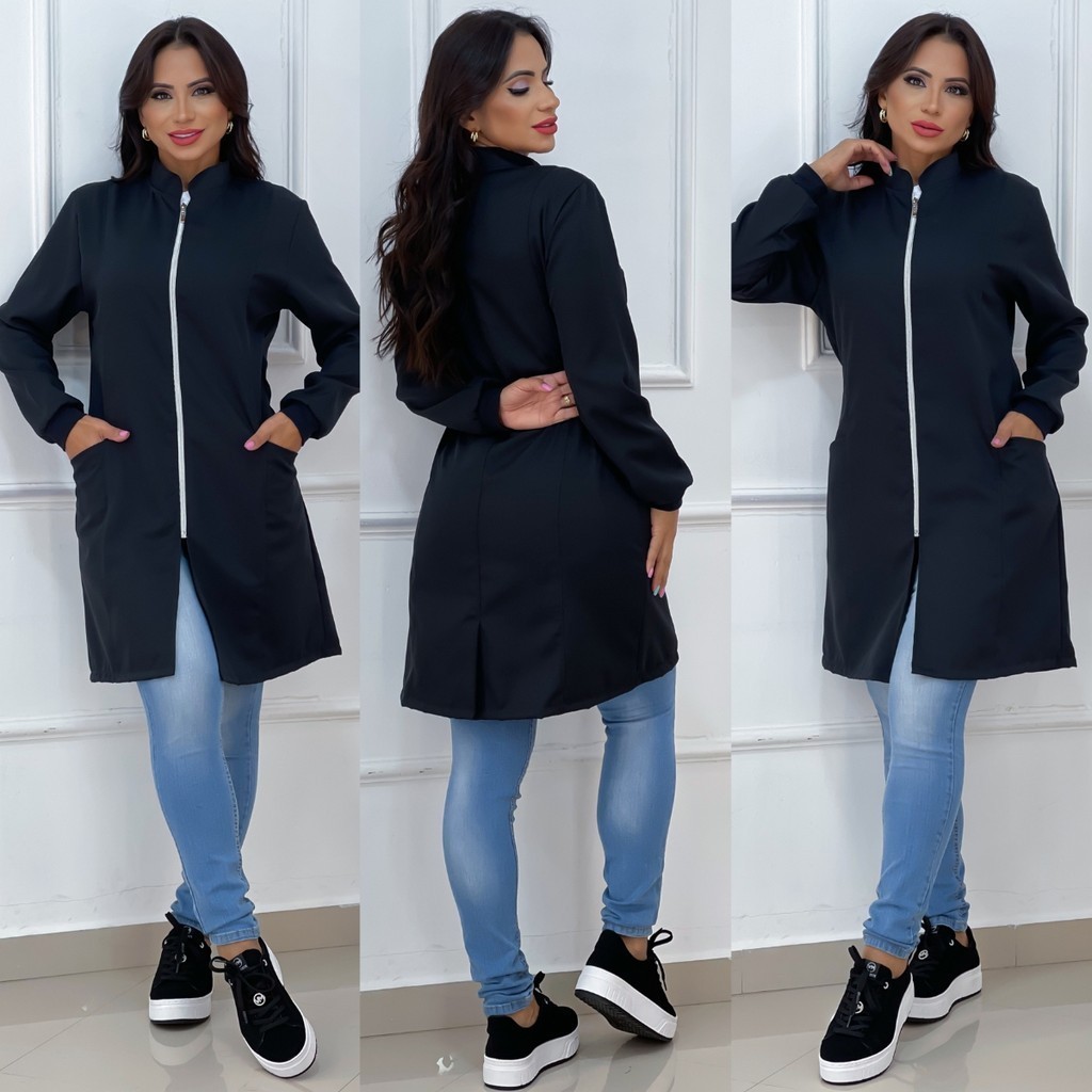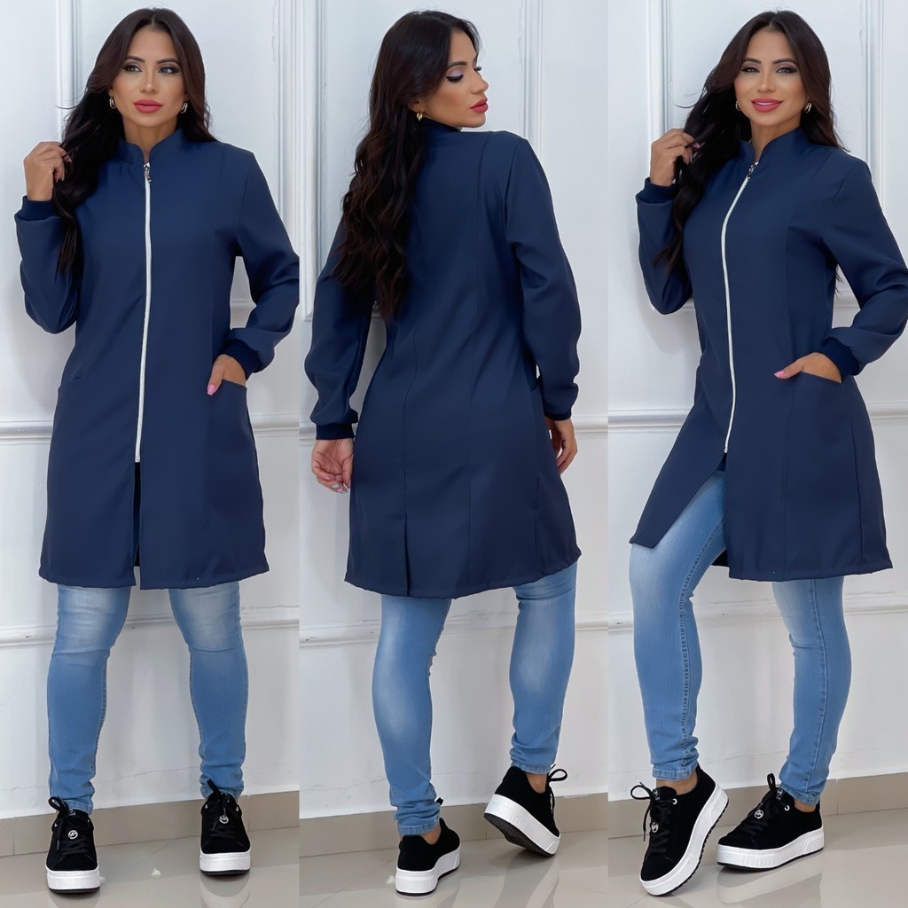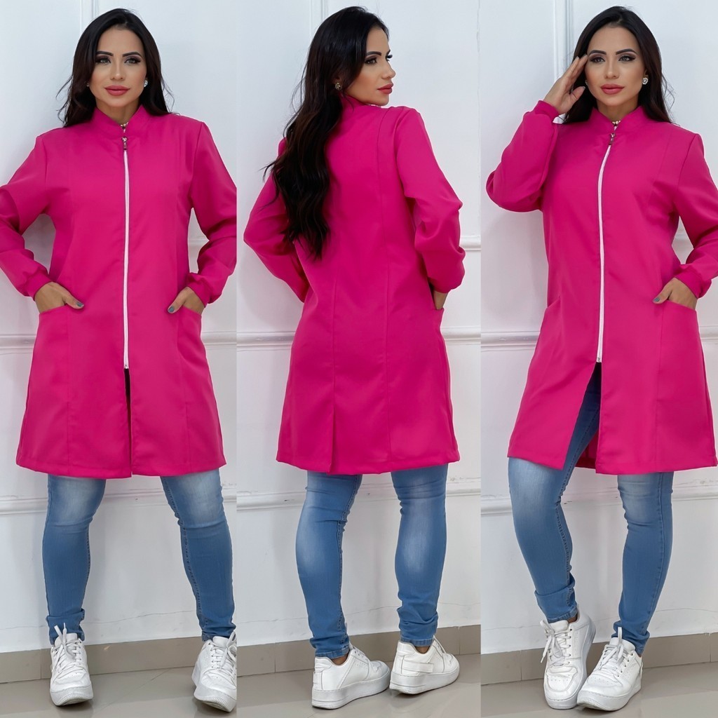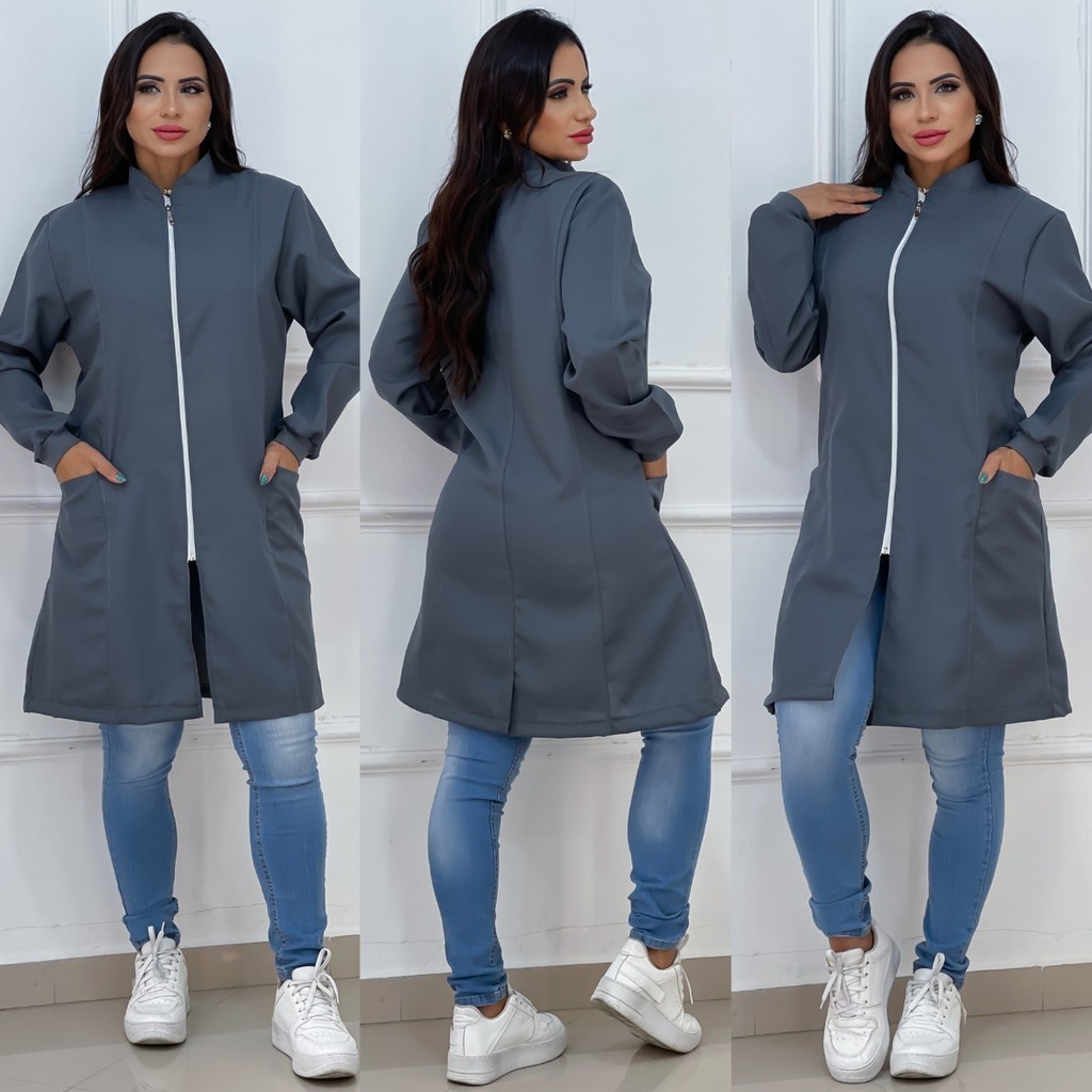 Jaleco Feminino Com Zíper Gola Padre Caimento Acinturado Manga Longa Bolso Lateral Tecido Premium