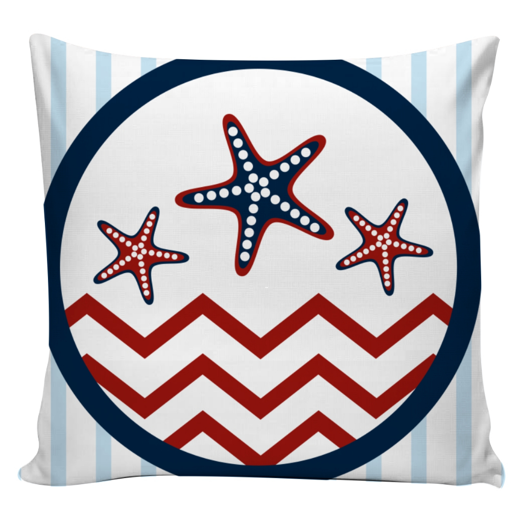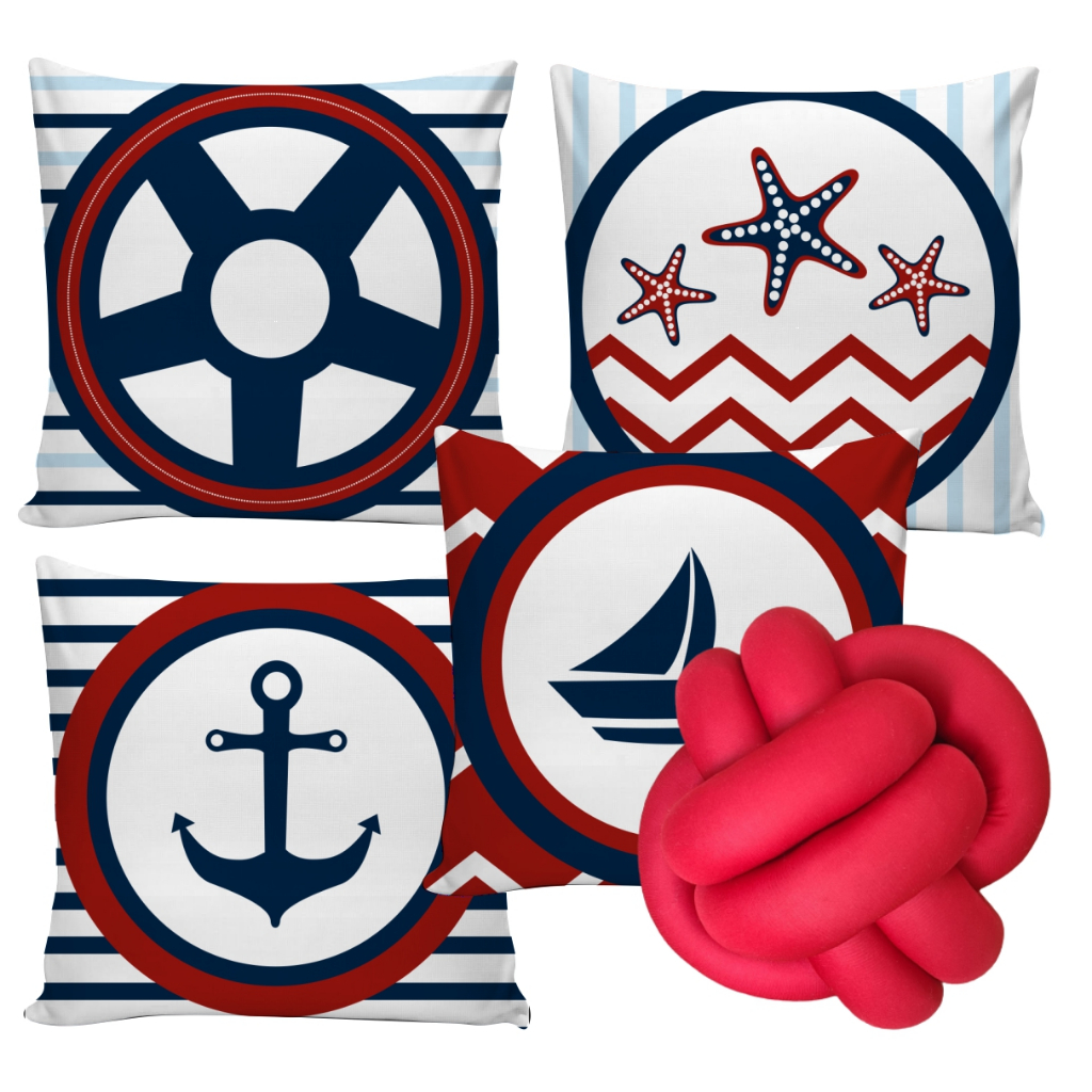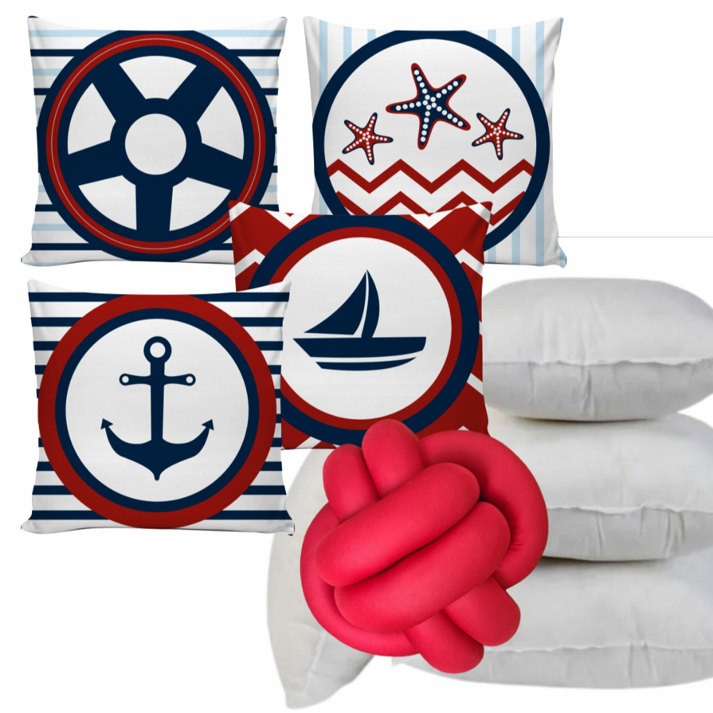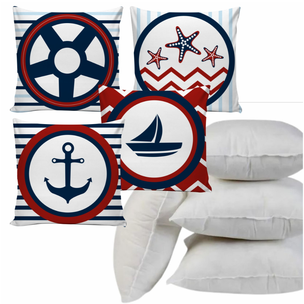 Kit 04 Capas de Almofadas Decorativas Náuticas Âncora, Barco, Estrela-do-mar 45x45cm