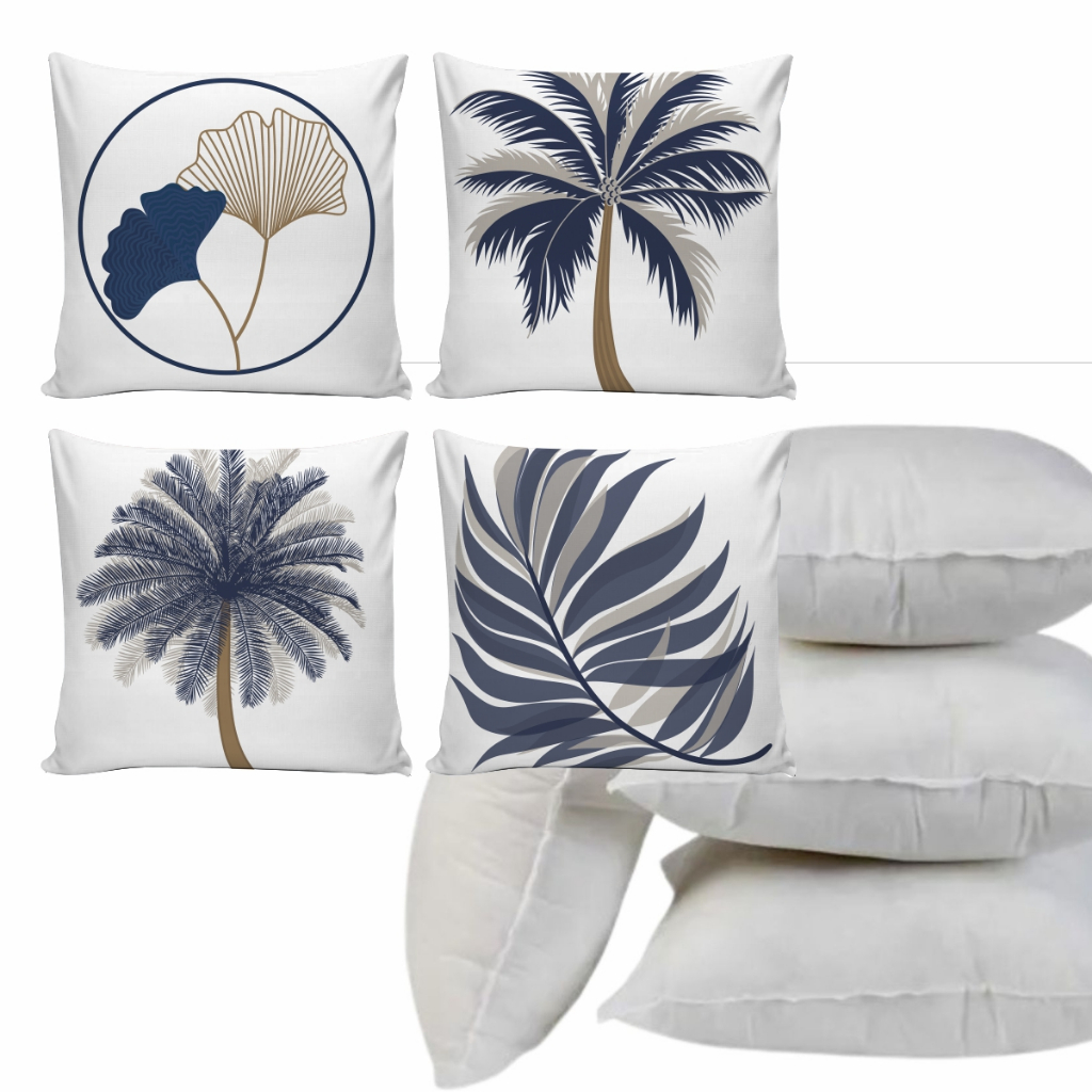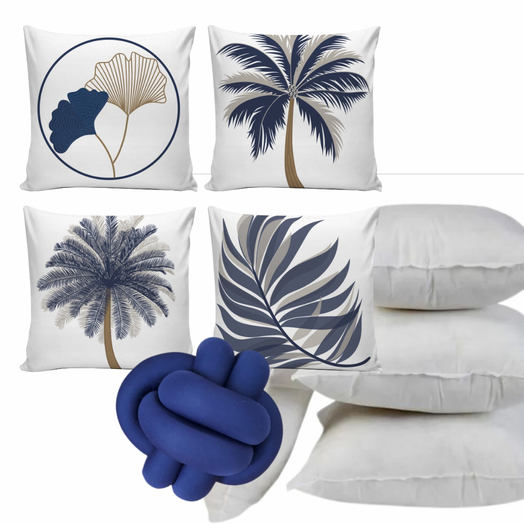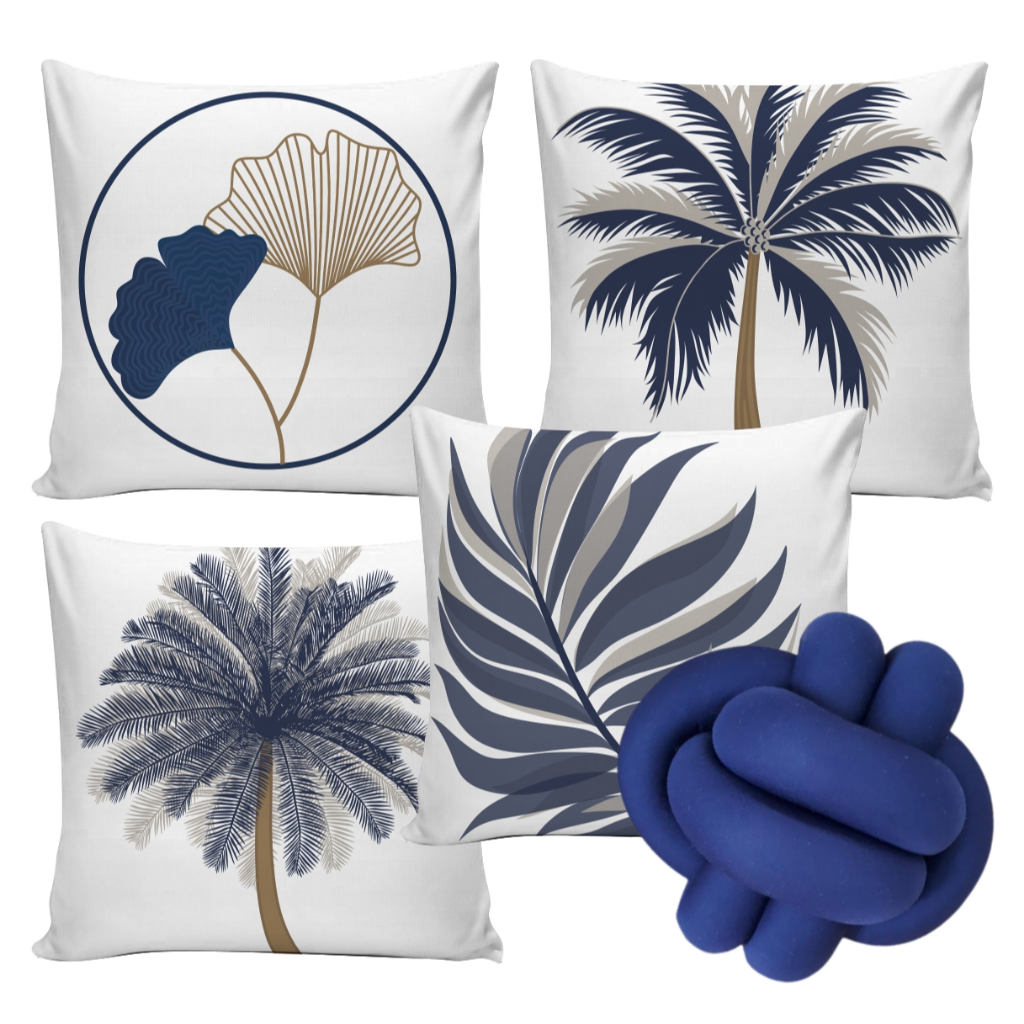 Kit 04 Capas de Almofadas 0,45cm x 0,45cm Tropicais Azul Marinho Decoração Moderna com Folhagens