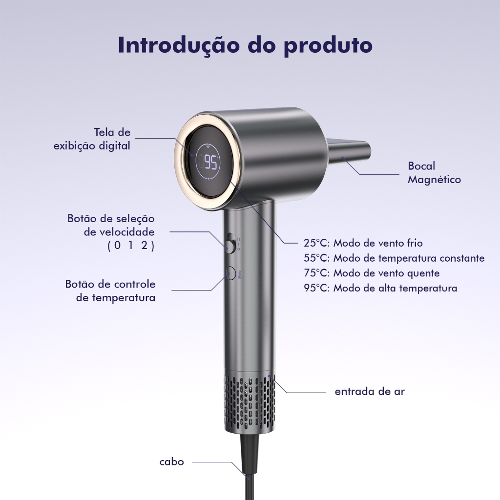 MORINA Secador de cabelo de alta velocidade 1500 watts Cinza com coletor de vento 127V