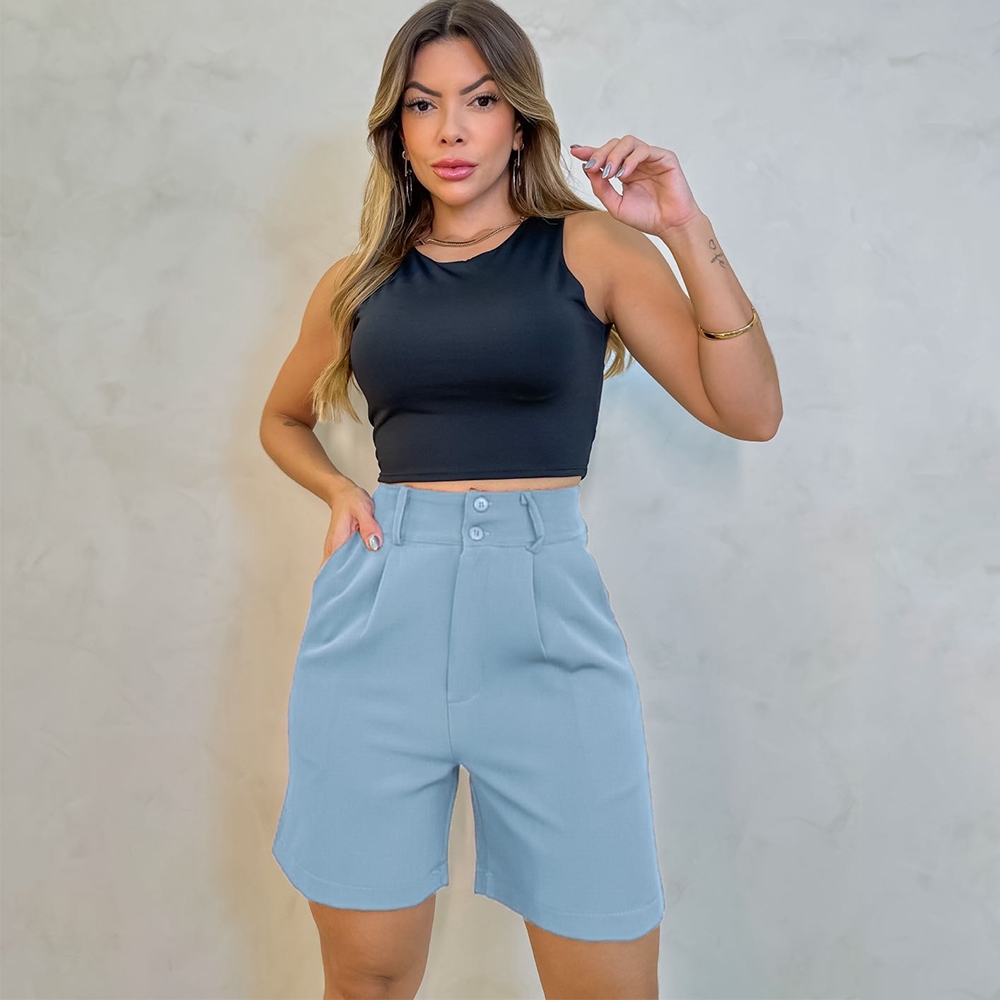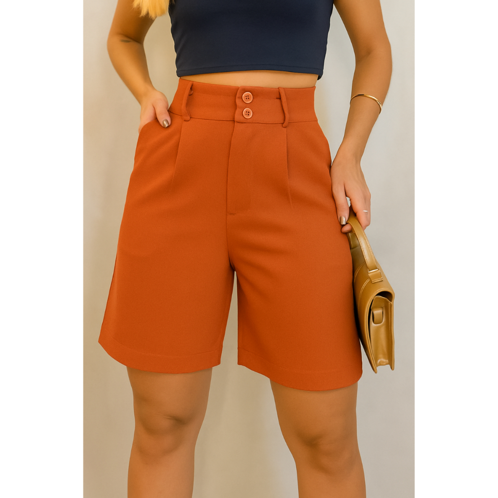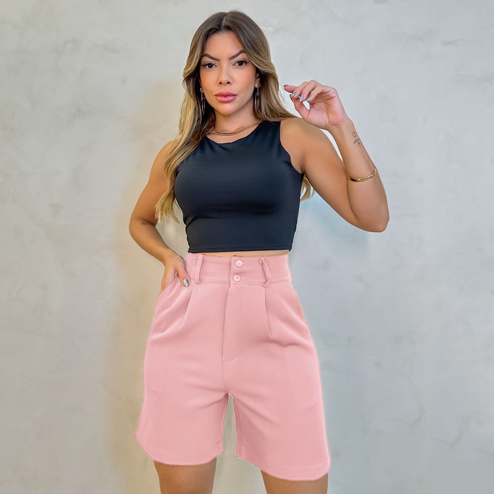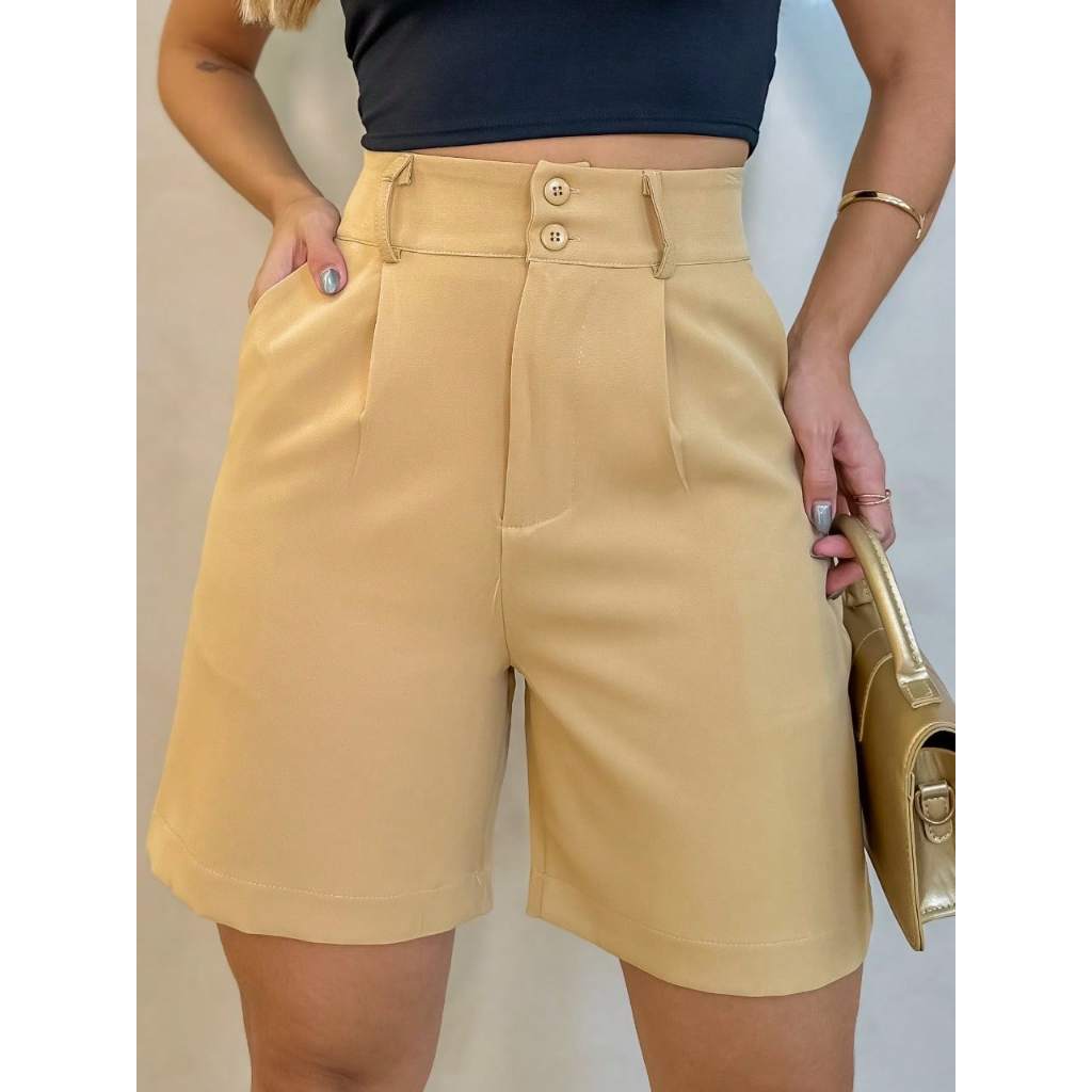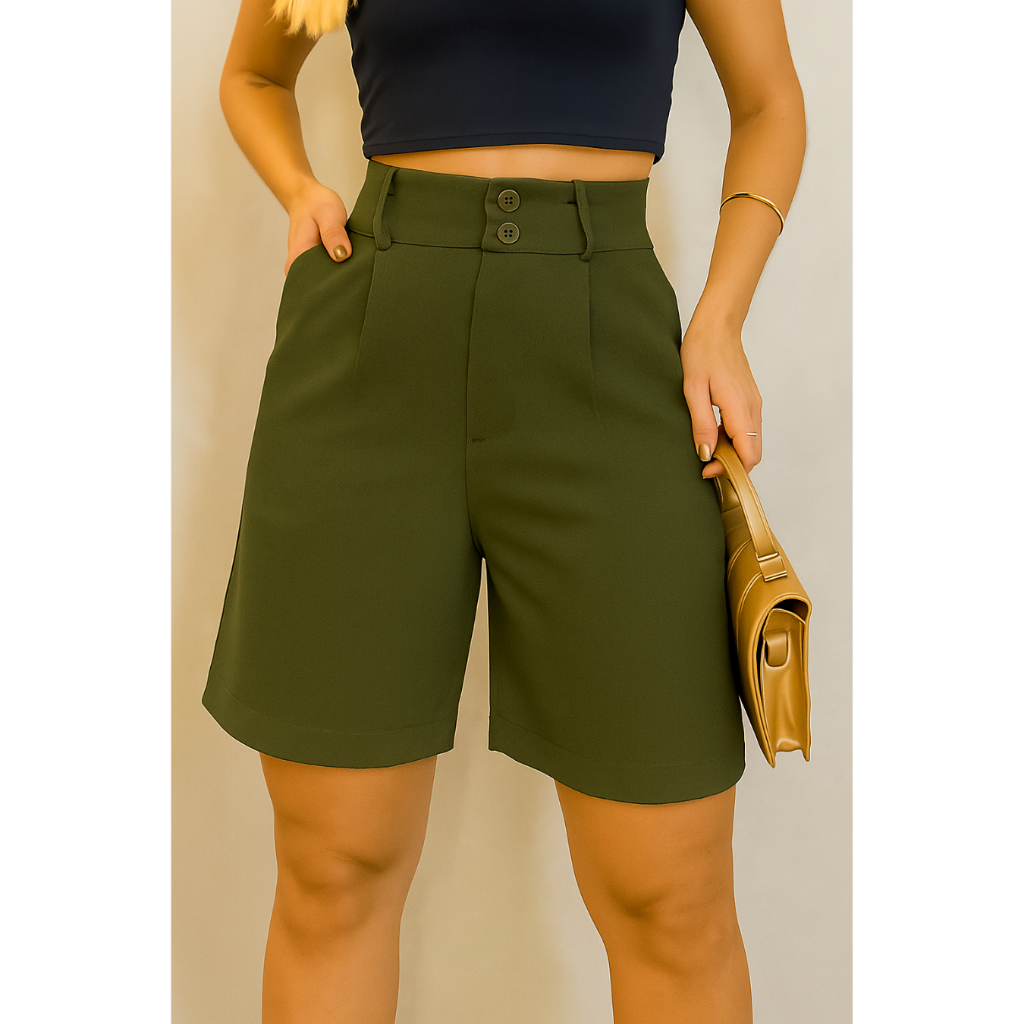 Short Alfaiataria Feminino Elegante Bolso e Barra Casual Conforto Elegante