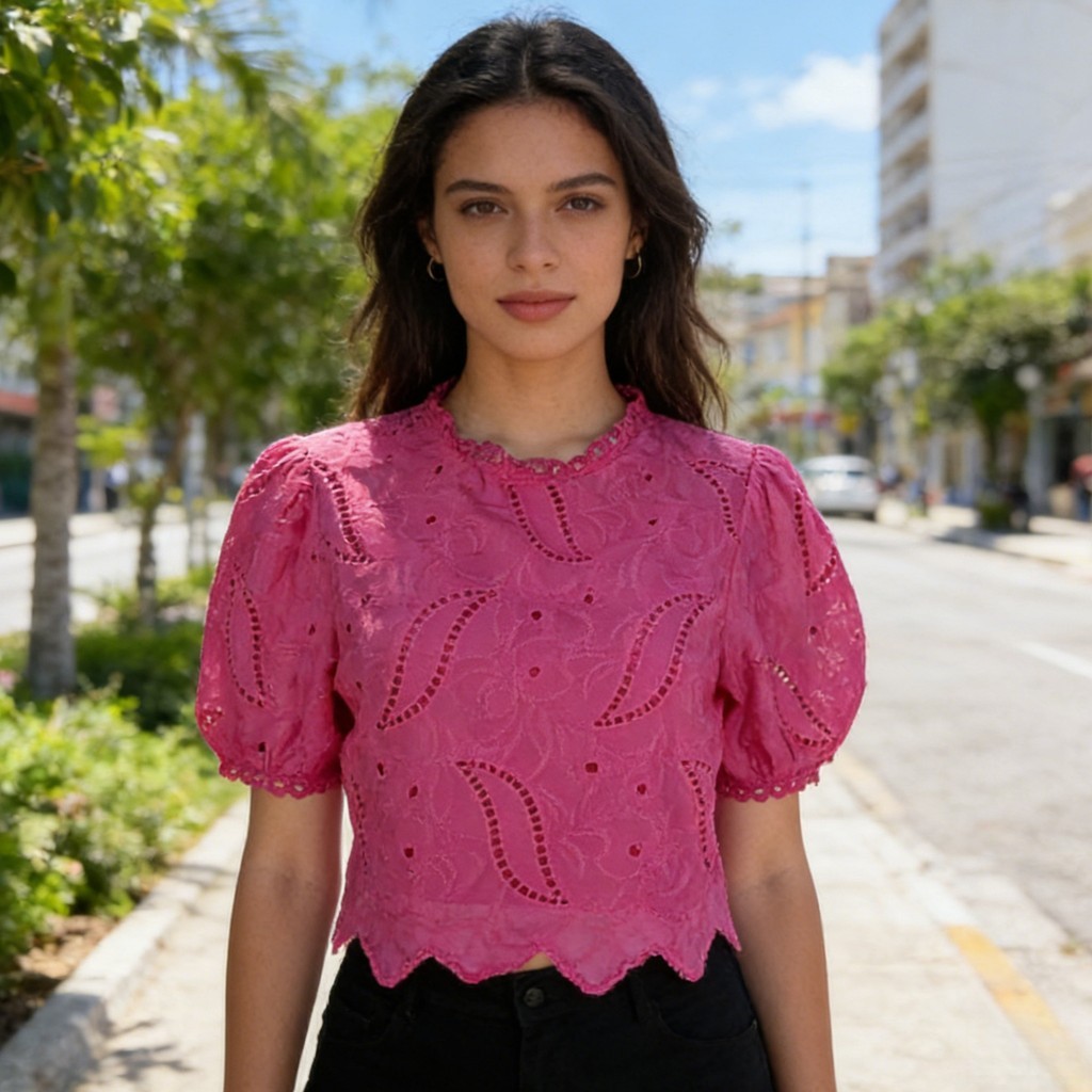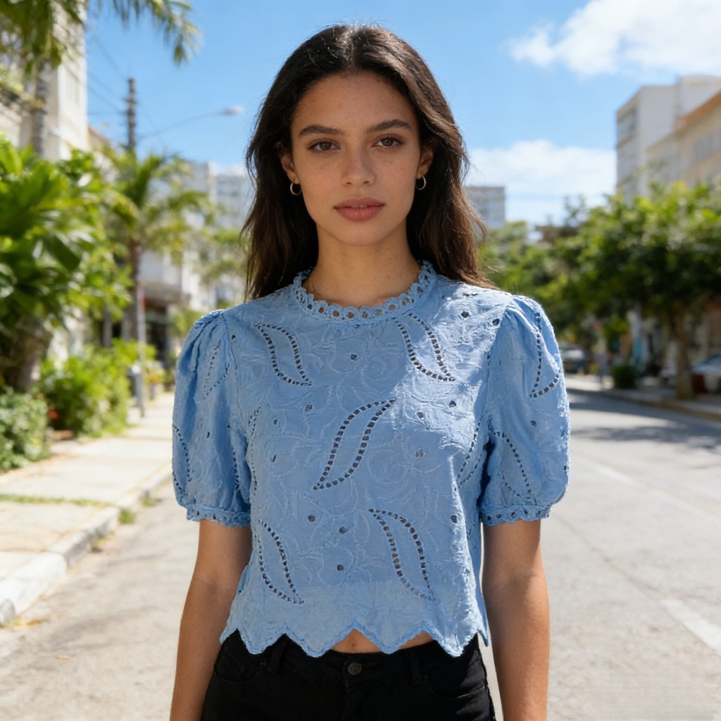 Blusa Feminina de Renda com Manga Curta Bufante e Borda Ondulada 815