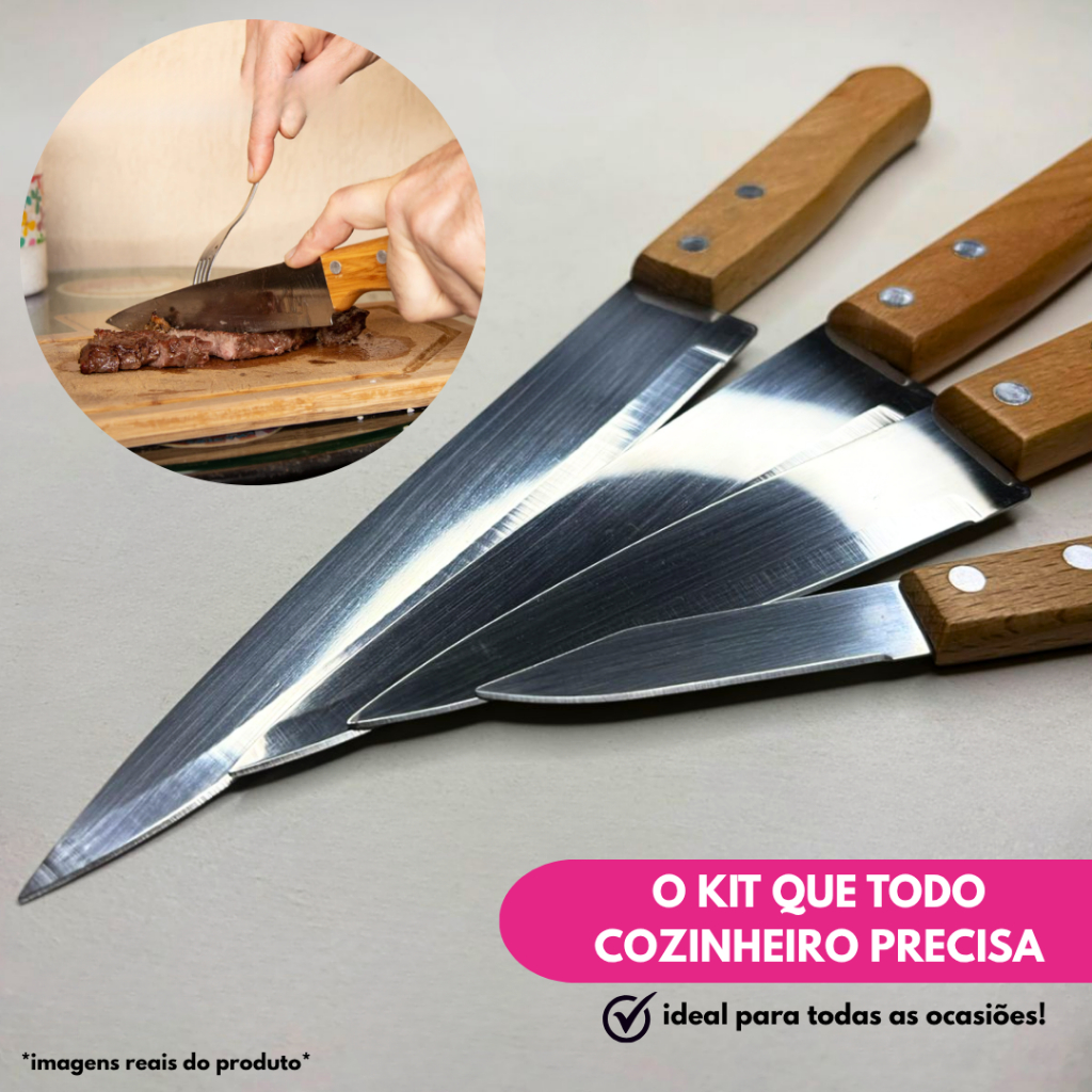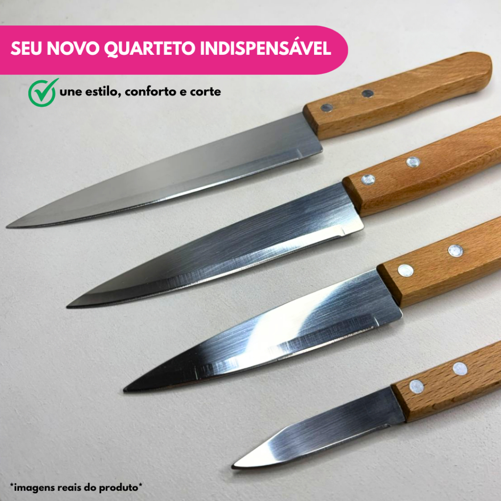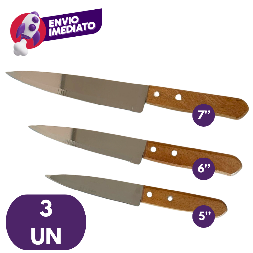 Kit Faca Peixeira Profissional 3", 5”, 6” e 7” Aço Inox Cabo Madeira Churrasco Cozinha Bar