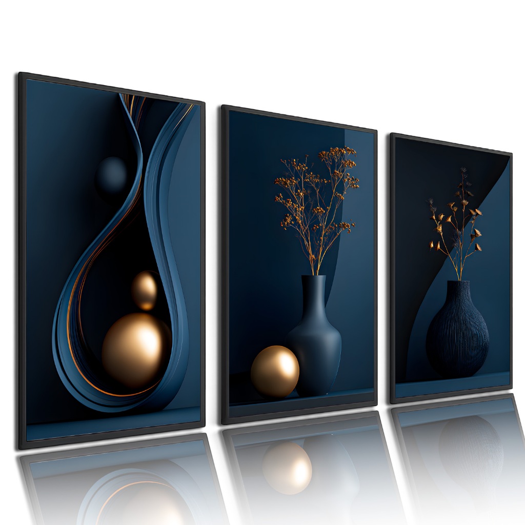 Kit 3 Quadros Decorativos Abstratos Azul e Dourado Luxo Moderno para Sala