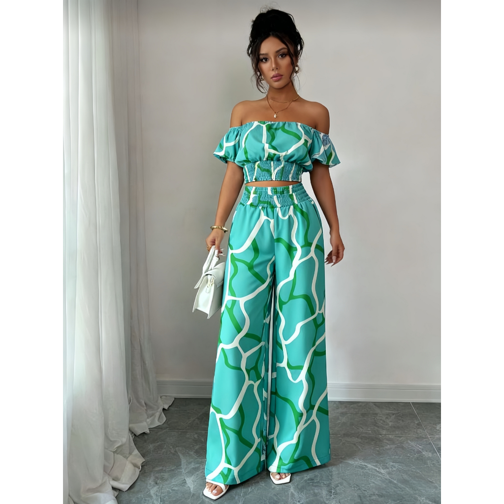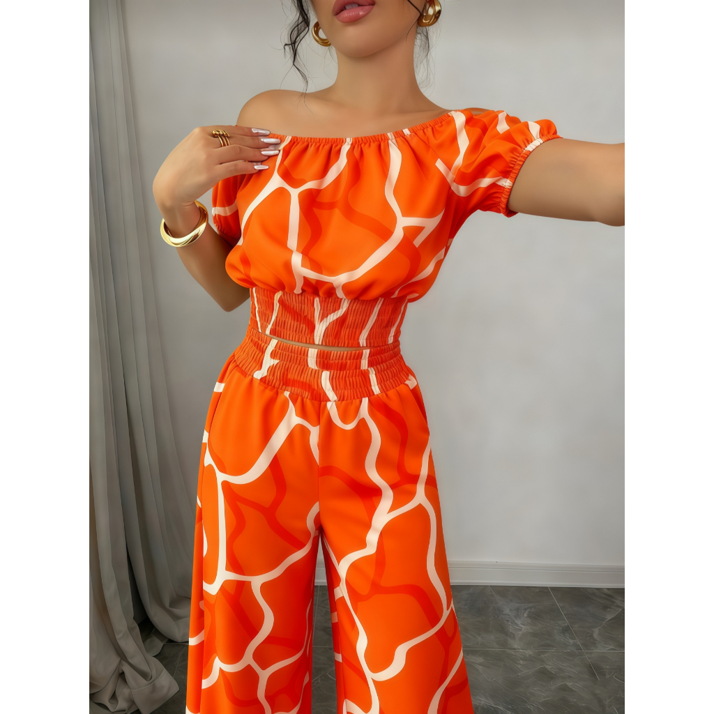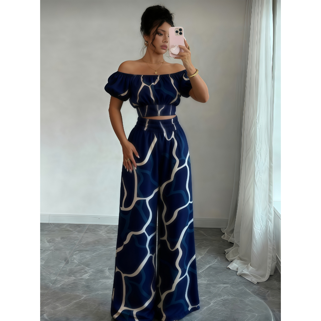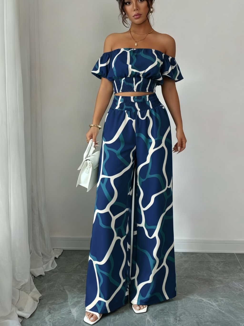 Conjunto de Camisa com Ombro Único e Calça de Estilo Geométrico Abstrato em Linhas para Mulheres E Corte Solto Estilo C