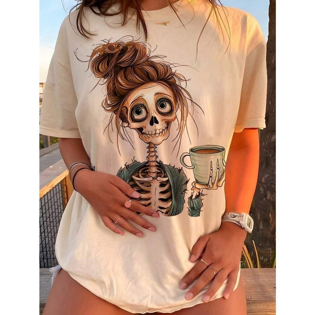 Camiseta Feminina 100% Algodão Fio 30.1 Lançamento Estampa de Caveira Mulher Verão Halloween