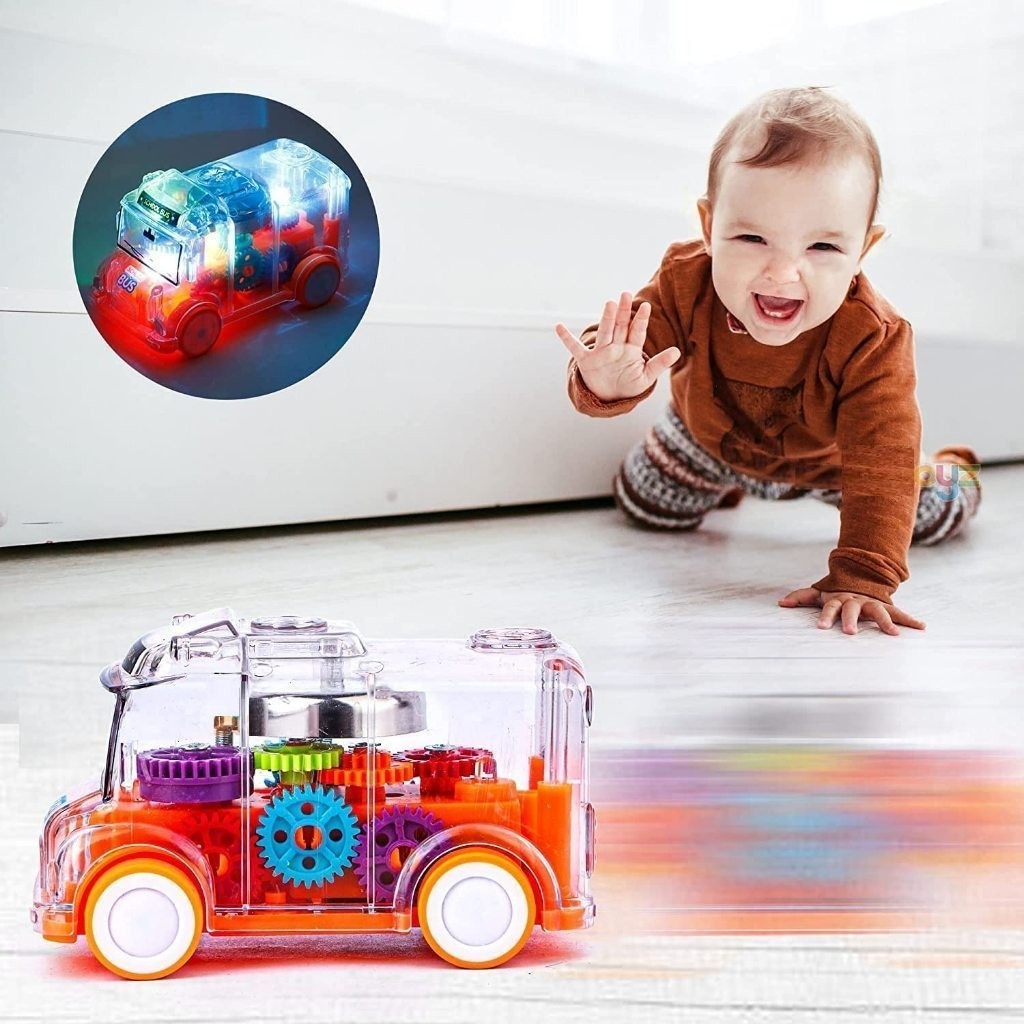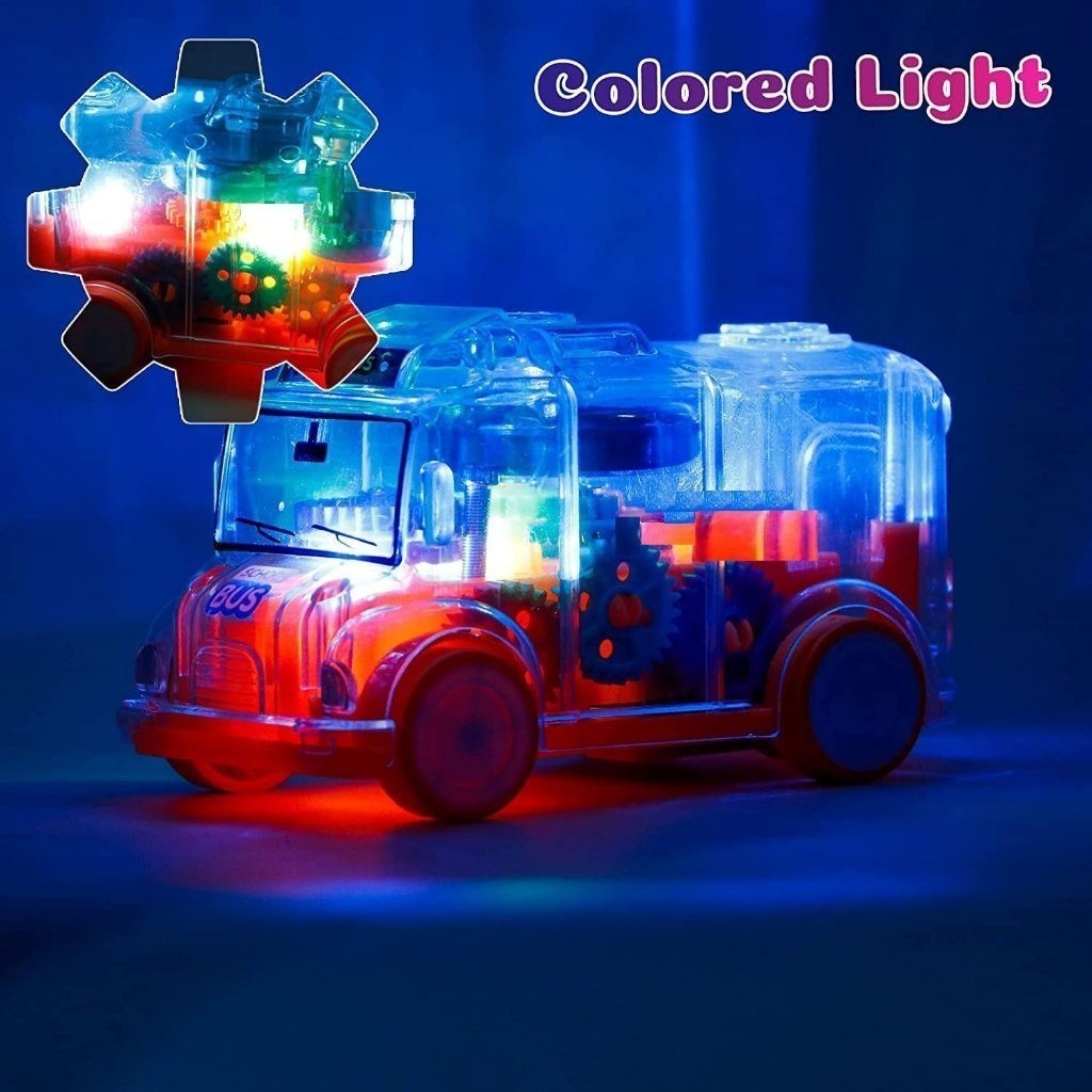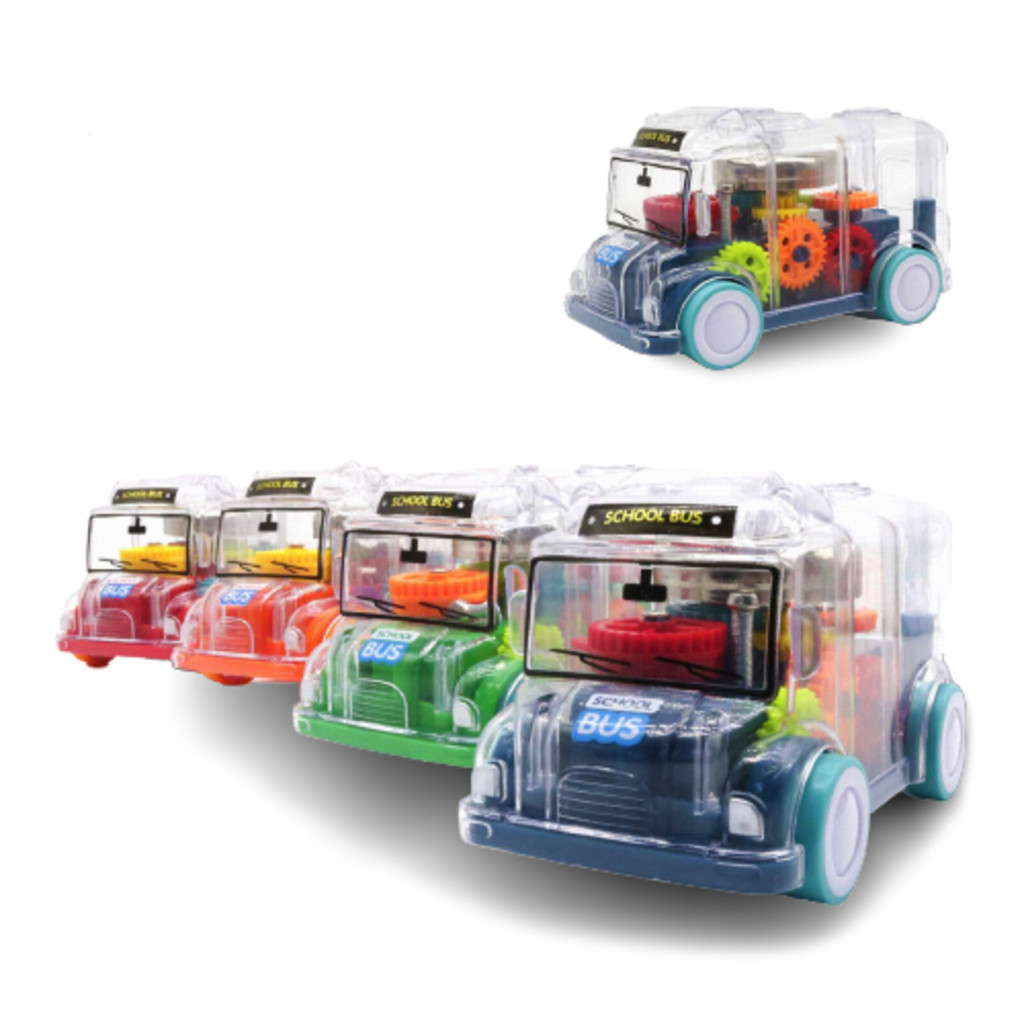 Carrinho Ônibus Escolar Transparente com Engrenagens- Com Luz e Som- Movimentação por Inércia (Fricção)- Brinquedo