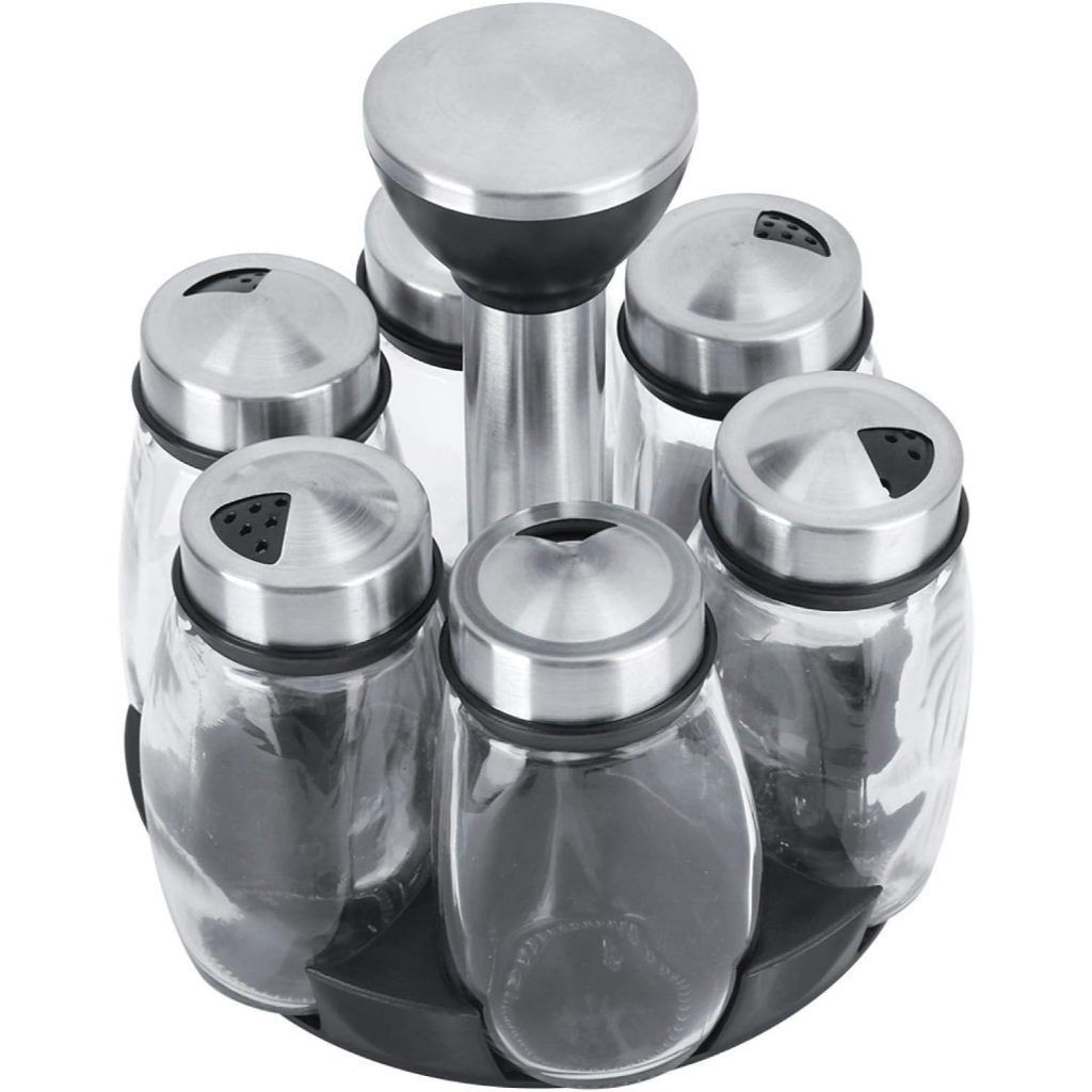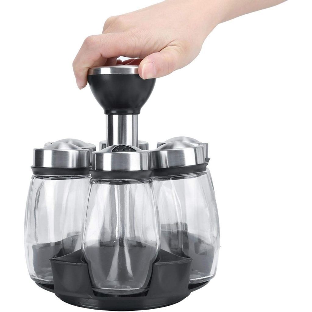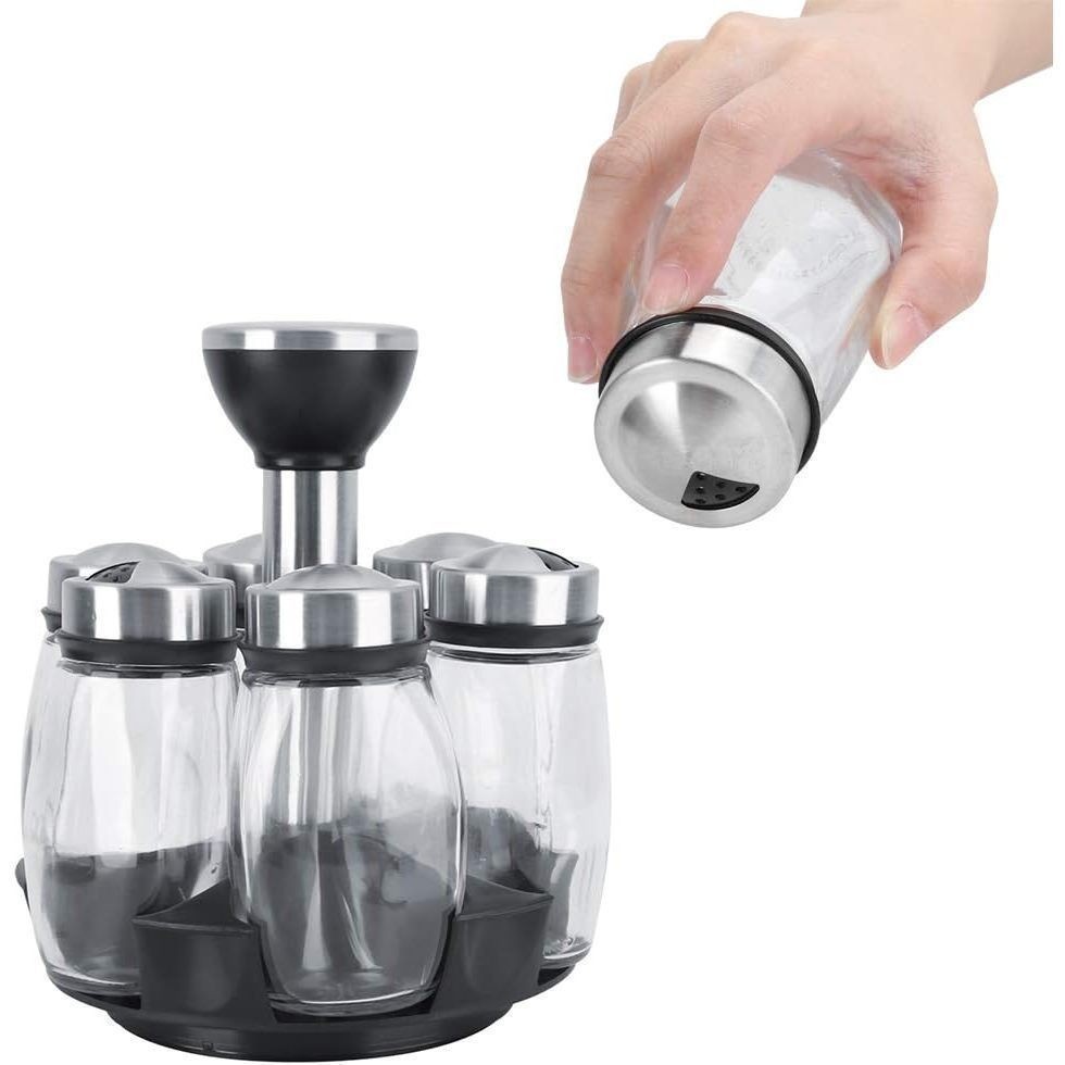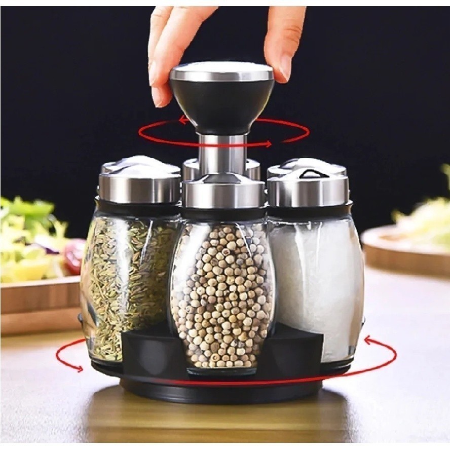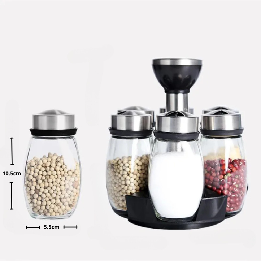 Porta Condimentos Giratório/Tempero Cozinha - Suporte com 6 Potes em Vidro + Suporte- 4 diferente furos de passagem