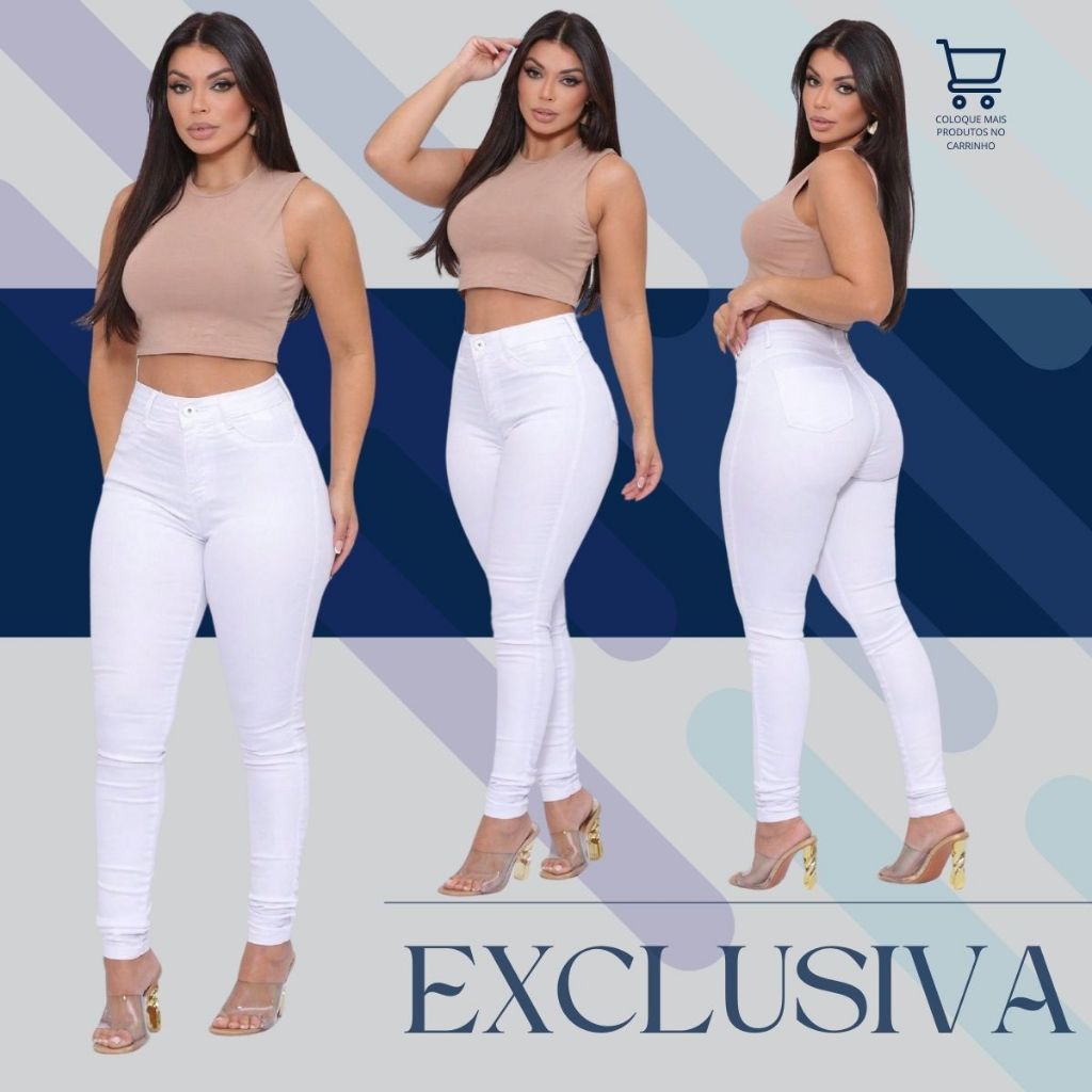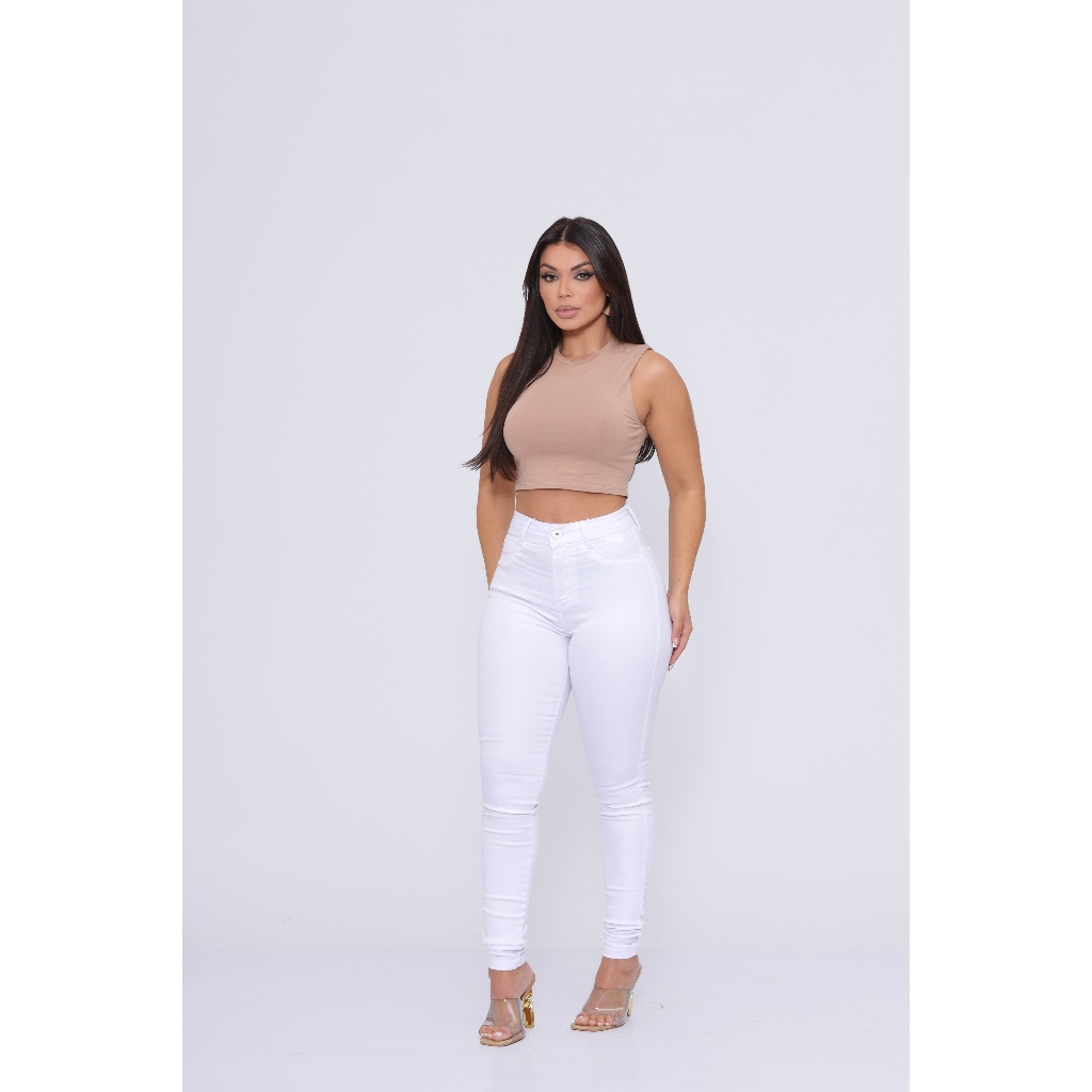 Calça Skinny Branca Feminina de Sarja com Lycra Cintura Alta Modelo Levanta Bumbum