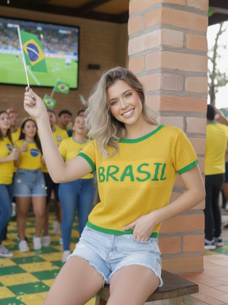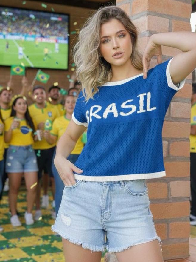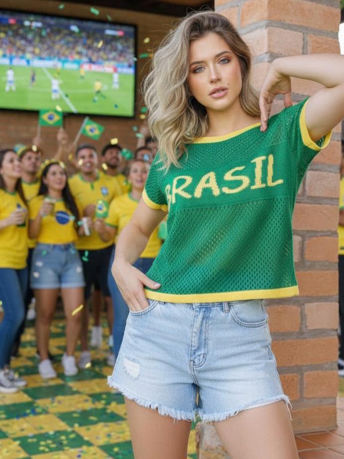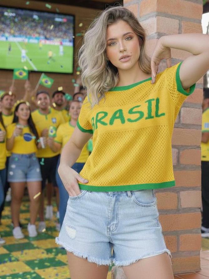 Camiseta Feminina em Tricot Telado Copa Brasil – Estilo Esportivo Fashion Veste 38 a 42