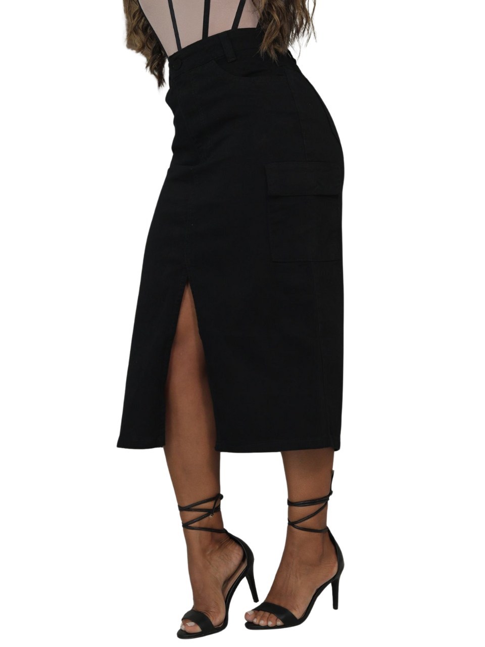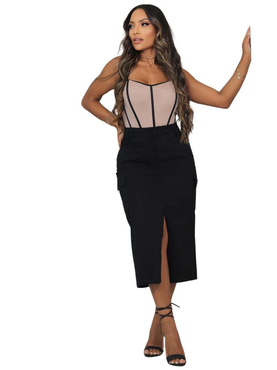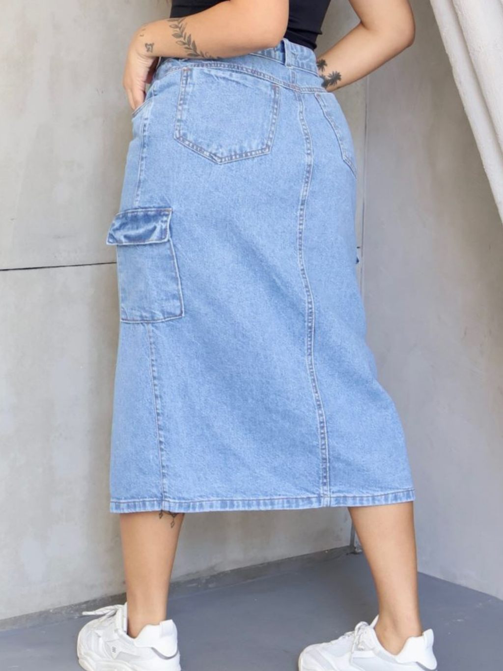 Saia Midi Cargo Jeans Feminina com Bolso Lateral