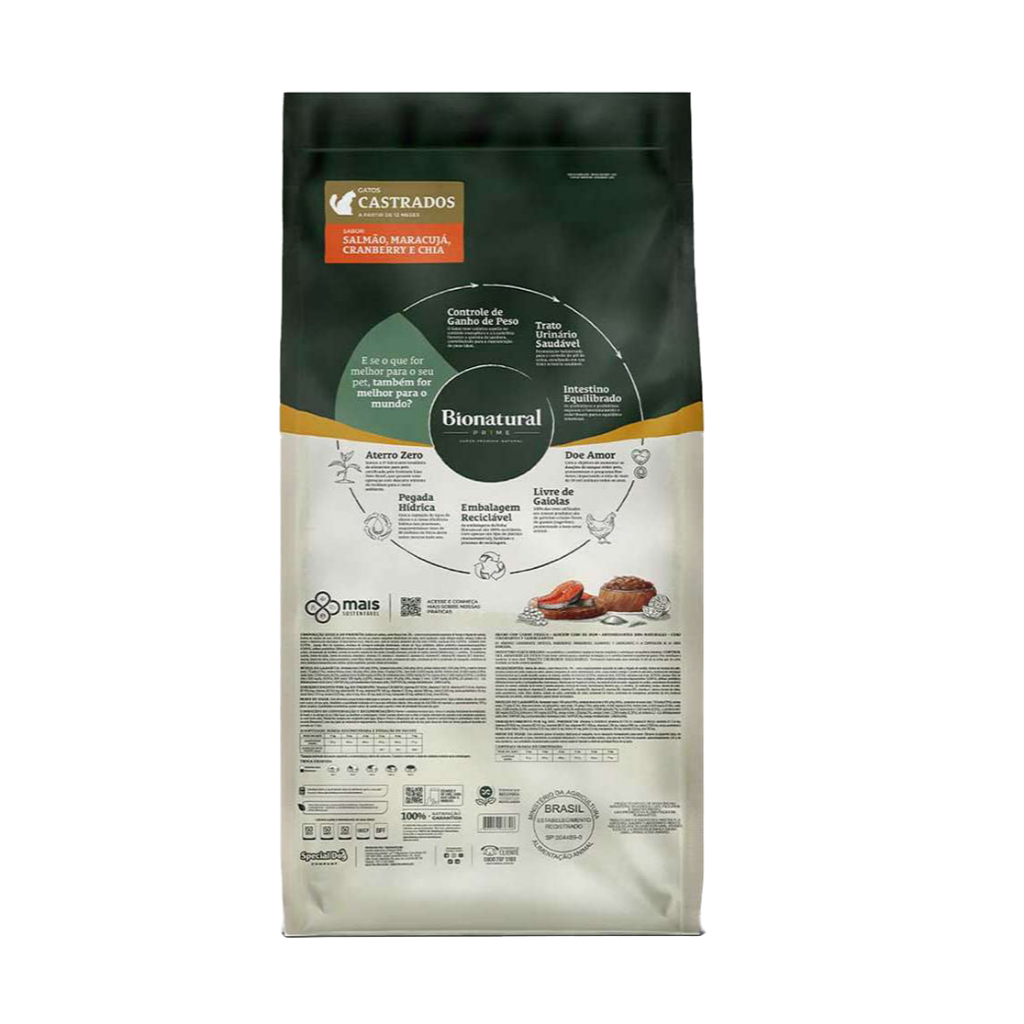 Ração Bionatural Prime para Gatos Castrados sabor Salmão 20 KG