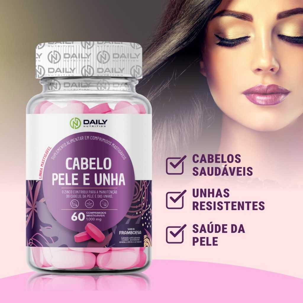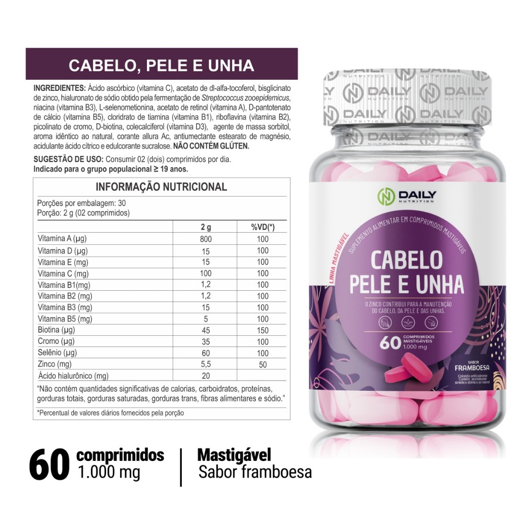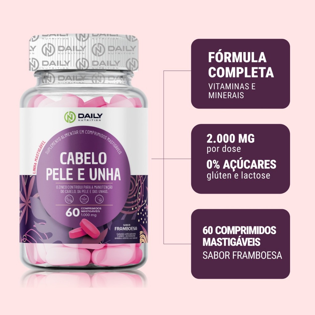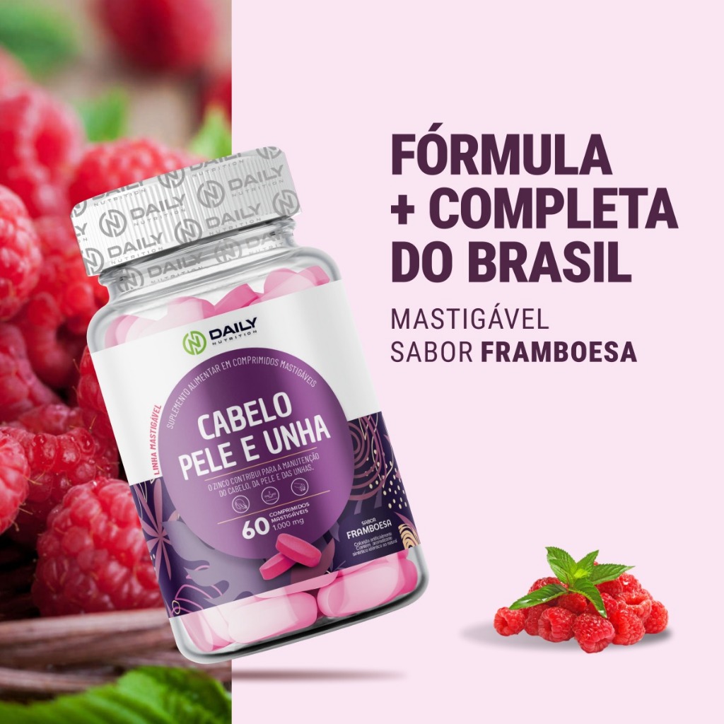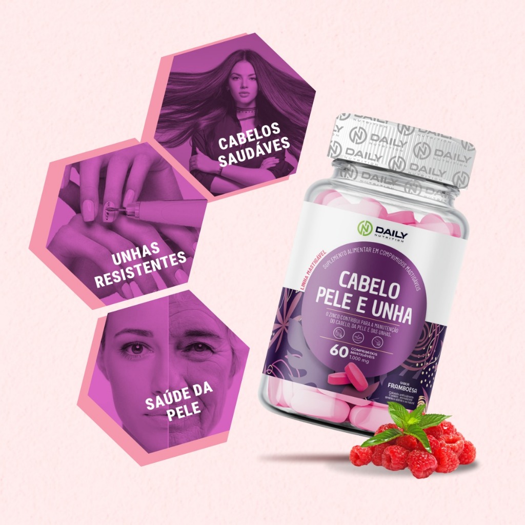 Cabelo, Pele e Unha Mastigável | Vitaminas com Zinco, Biotina e Ácido Hialurônico - Sabor Framboesa