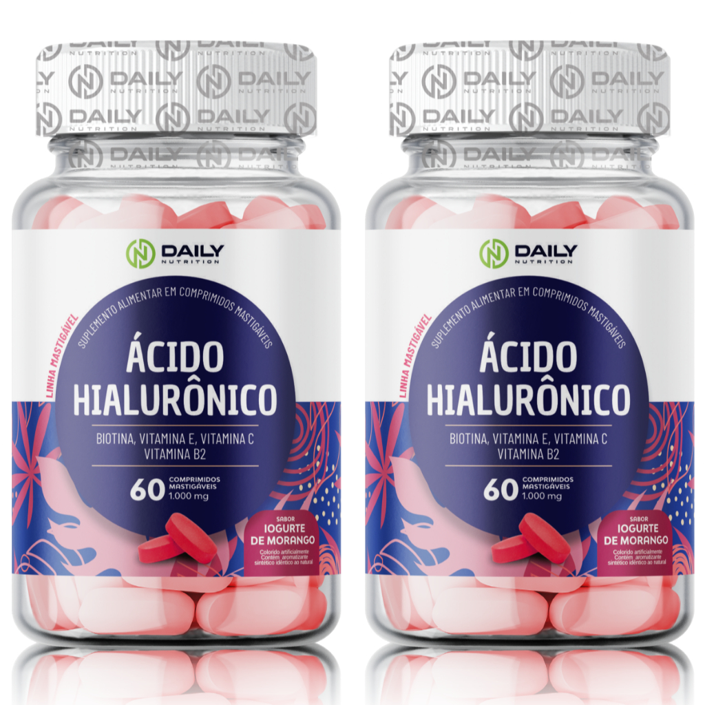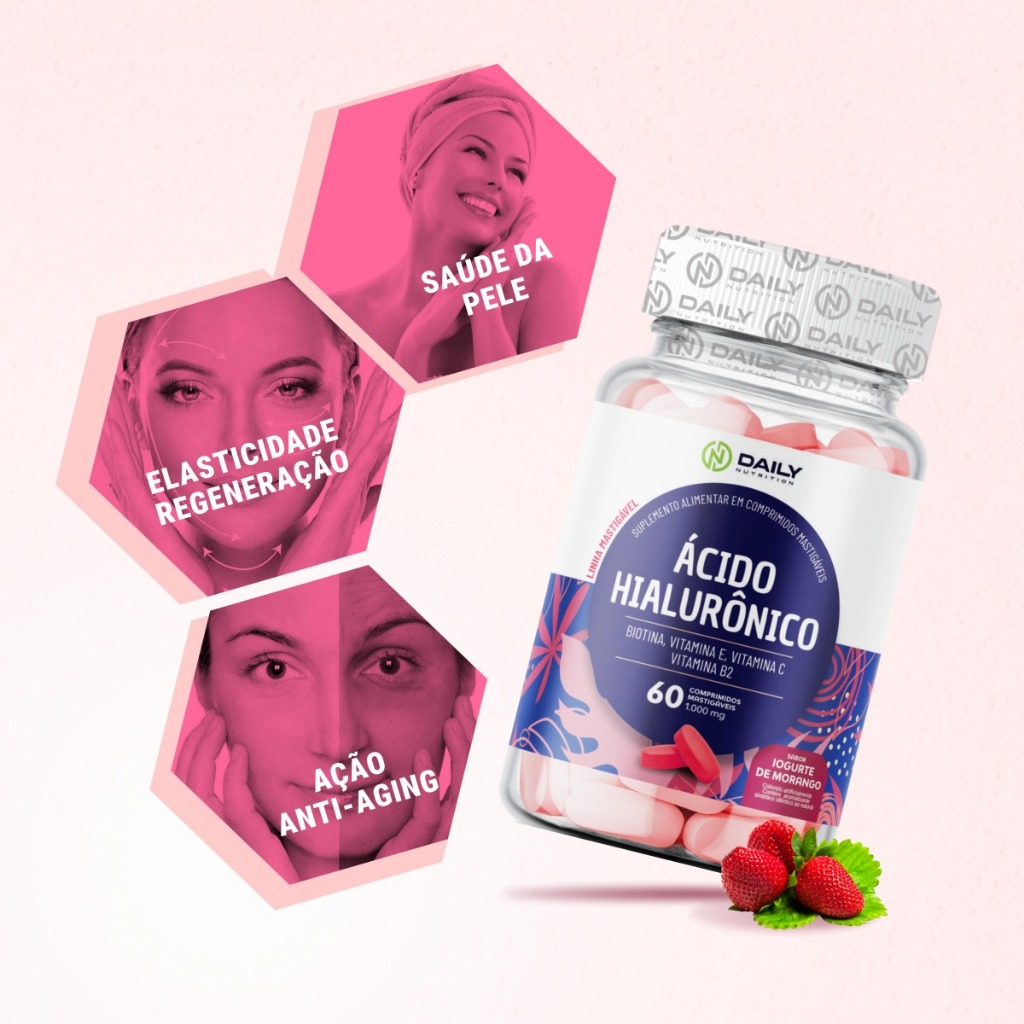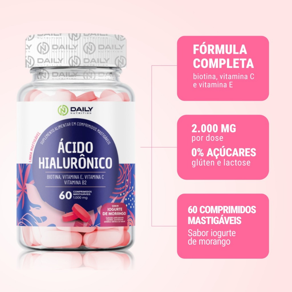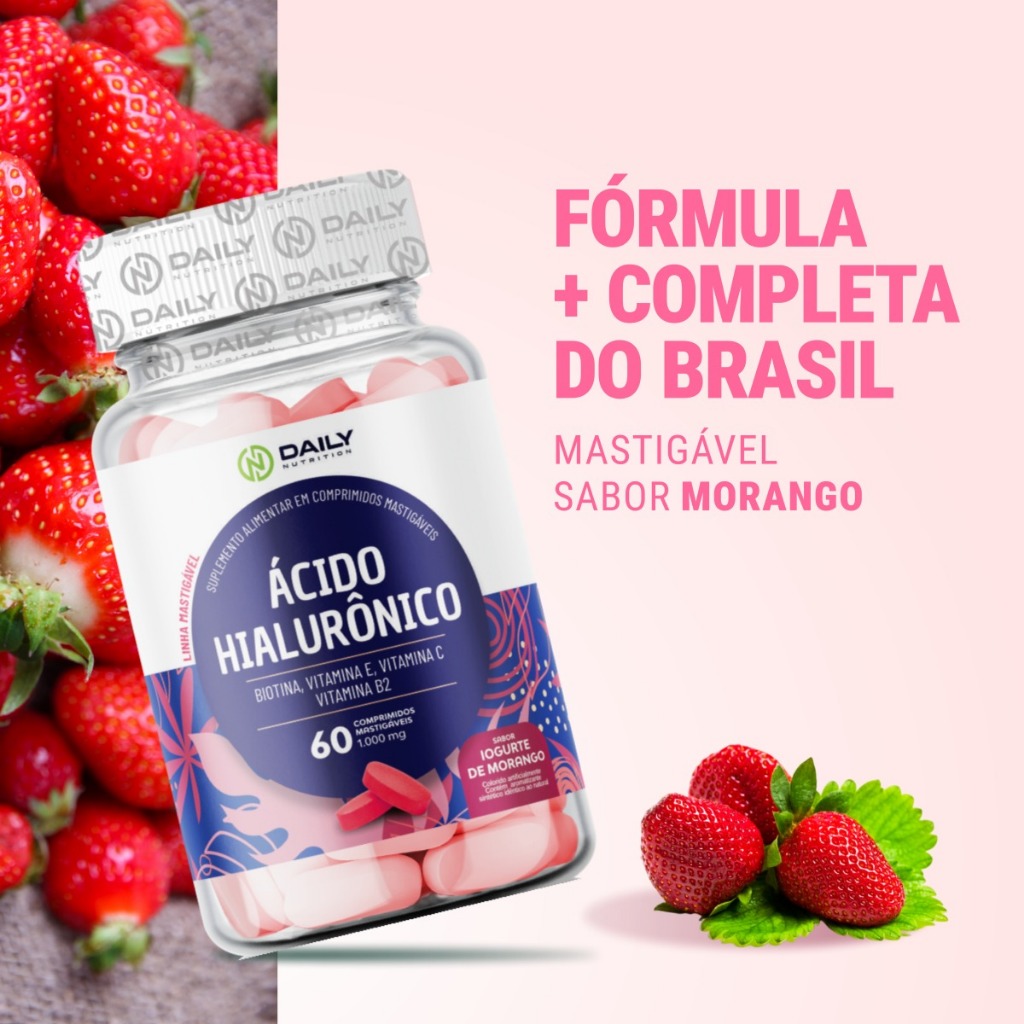 Ácido Hialurônico Mastigável Biotina Vitamina E C B2 para cabelos e pele Sabor Iogurte de Morango