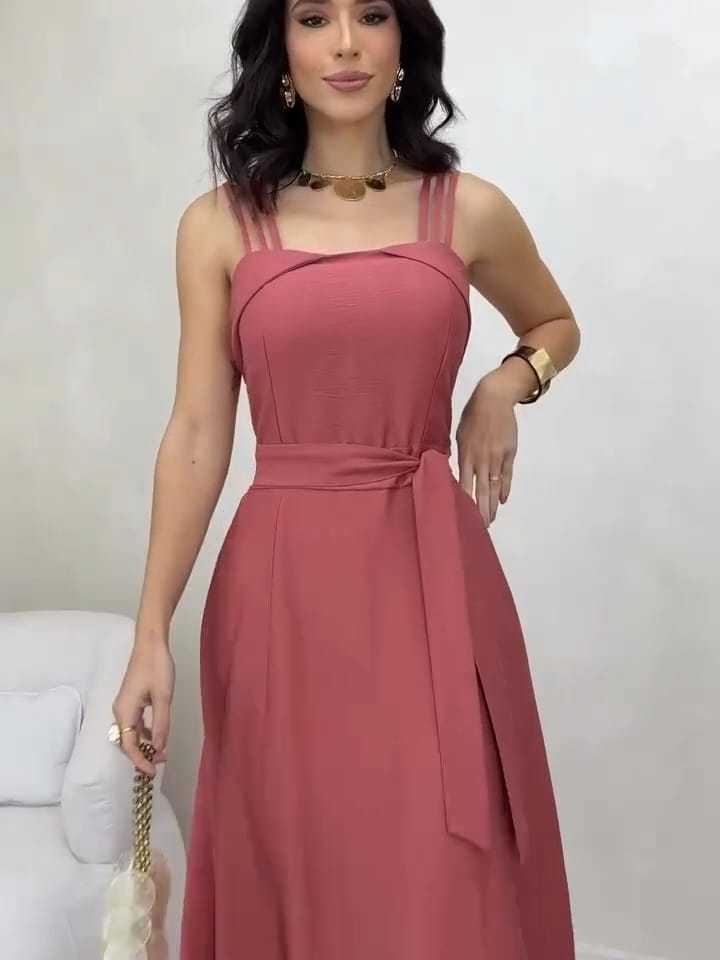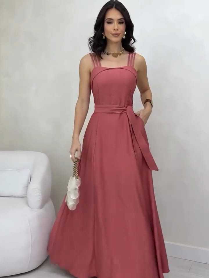Vestido longo alça triplo possui bojo , bolso e elástico nas costas com cinto. (B0011)