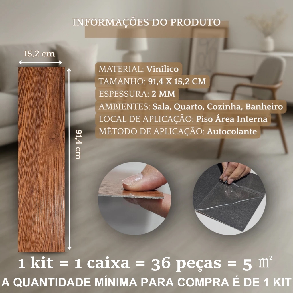 Kit 36/72 Placas Adesivas Autocolantes Piso Estilo Madeira 91 cm x 15 cm cobertura 5m²/10m²