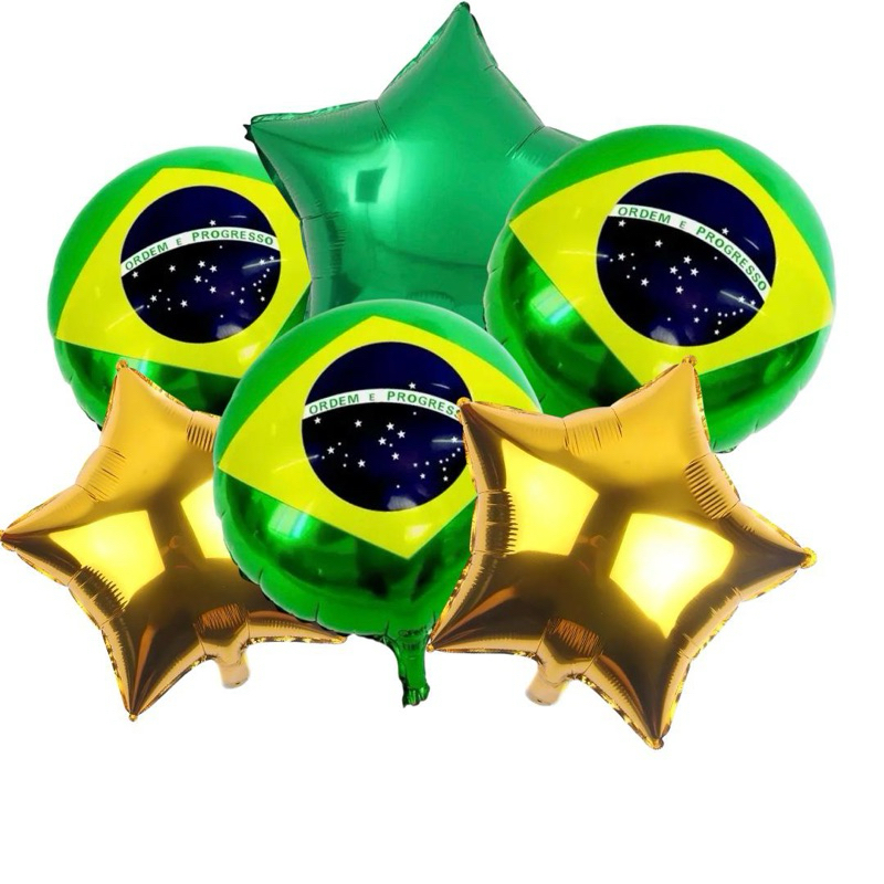 Kit C/6 Balões Metalizados 3 BANDEIRA DO BRASIL 45cm + Estrela 2 DOURADO 1 VERDE 45cm COPA