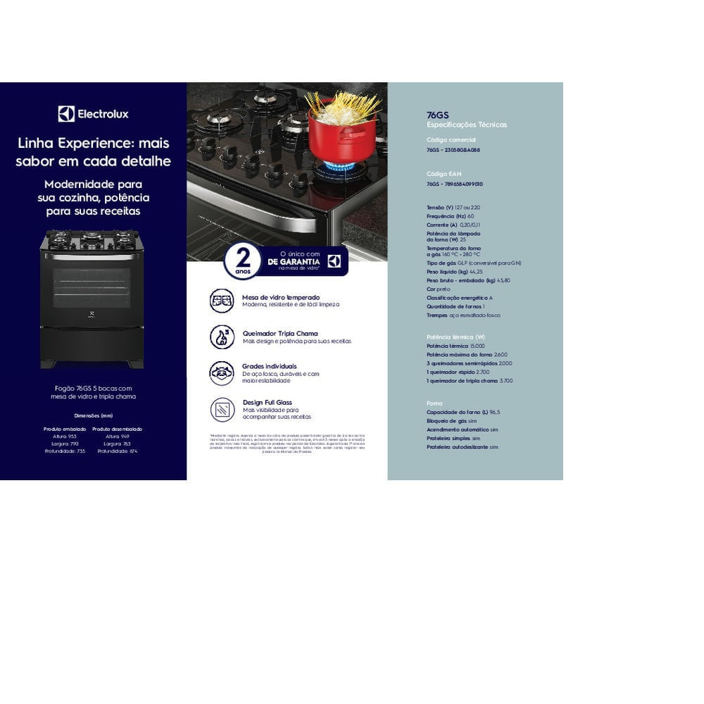 Fogão de Piso Electrolux 5 Bocas Automático com Mesa de Vidro Tripla Chama (76GS) - Bivolt