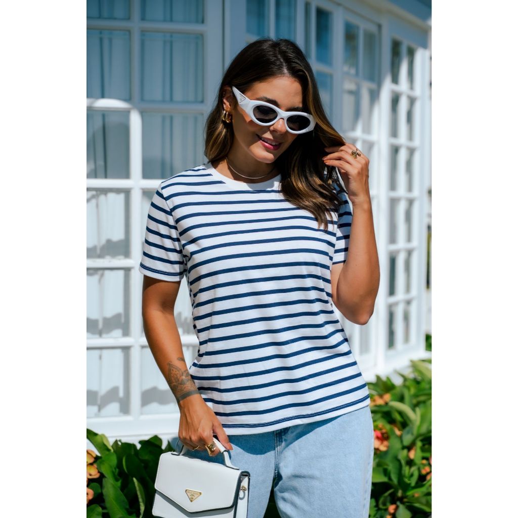 Blusa Tshirt Listrada Tendência Verão Gola Redonda em Algodão de Alta Qualidade Básica