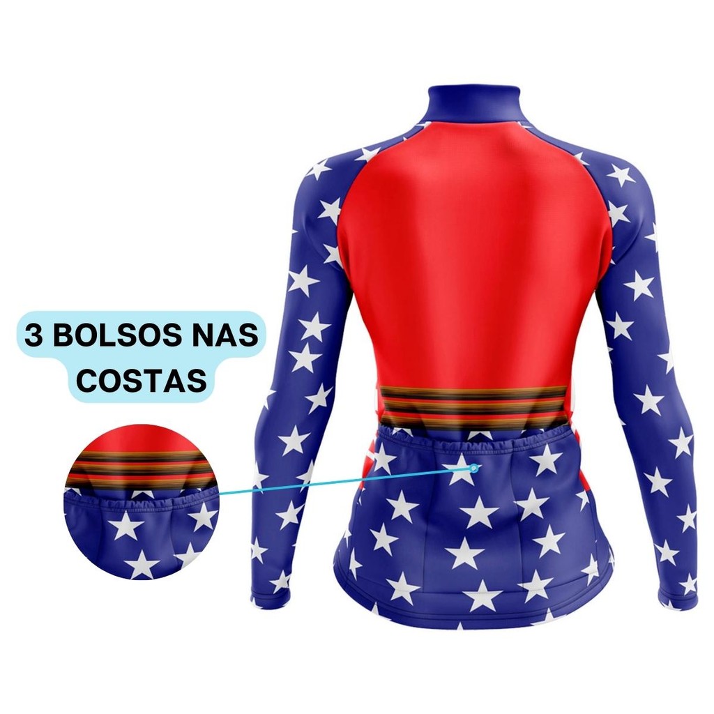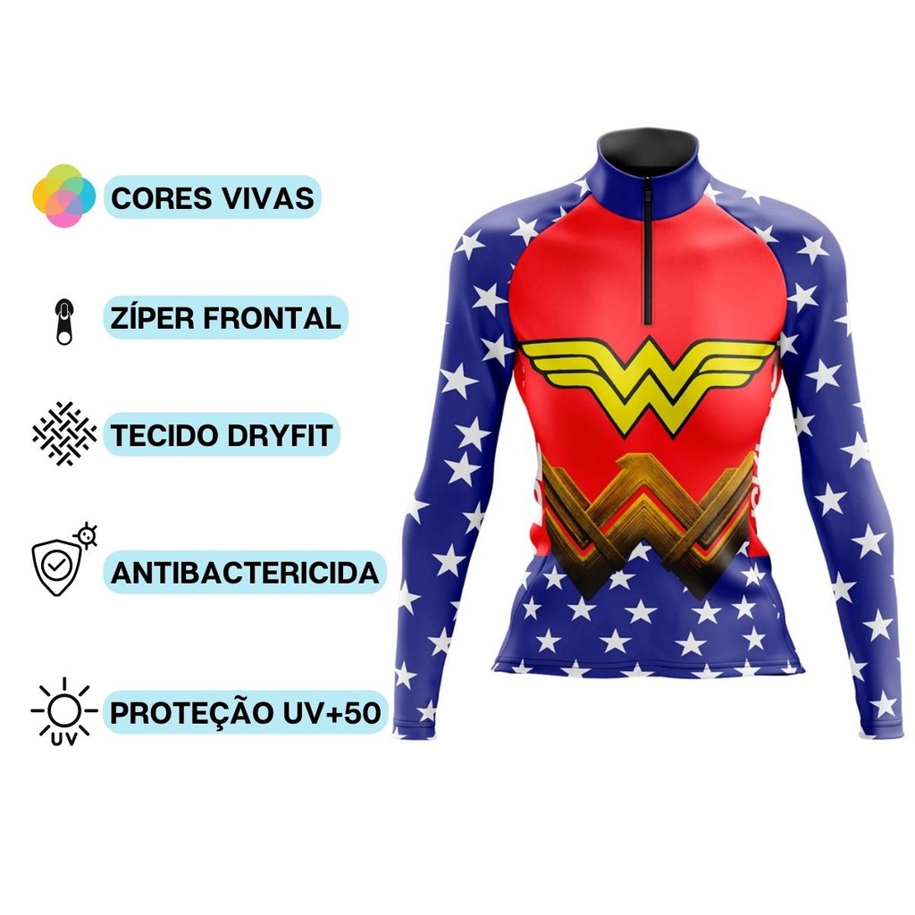 Camisa Ciclismo Feminina Manga Longa Mulher Maravilha Estrelas uv+50
