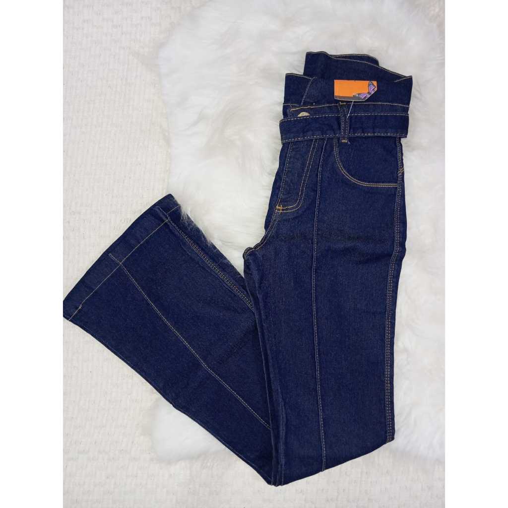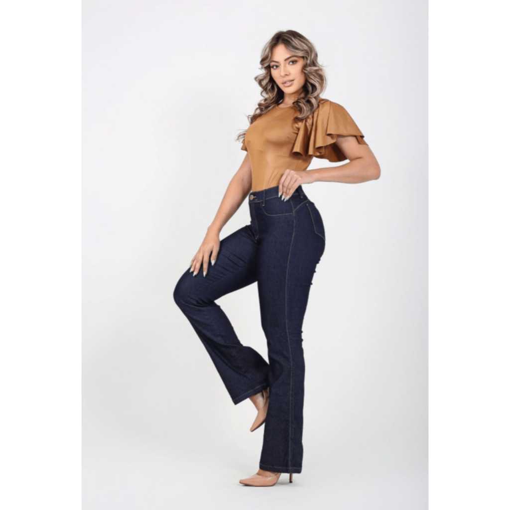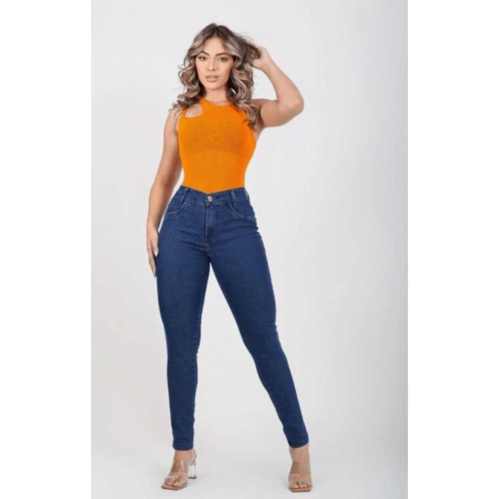 Calça jeans feminina cintura média/alta com lycra levanta bumbum skinny/flare/boca de sino
