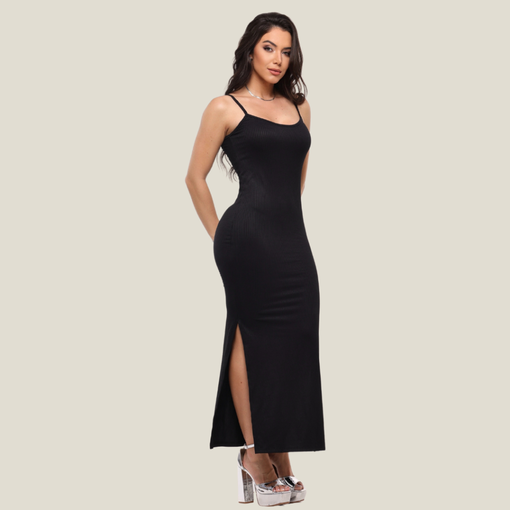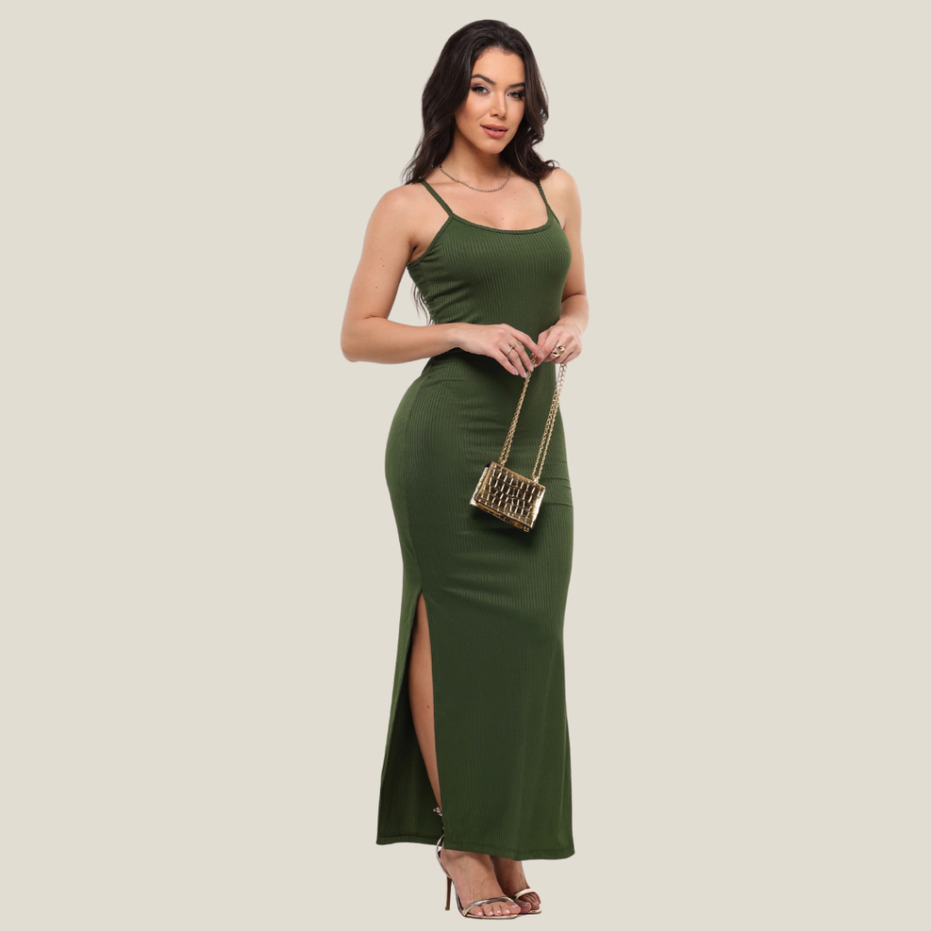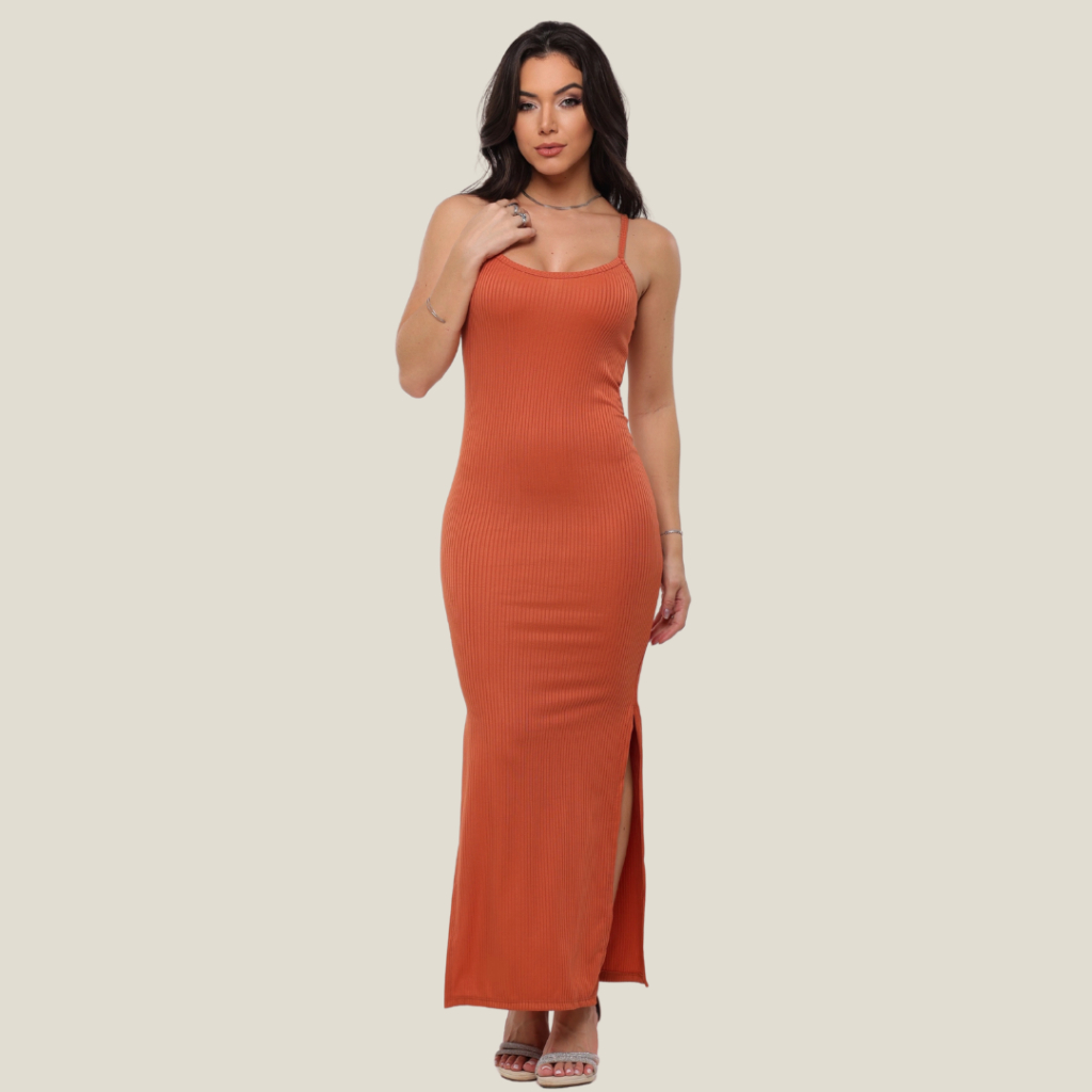 Vestido Longo Canelado Slim com Fenda Lateral e Alça Fina Decote Quadrado Sem Bojo