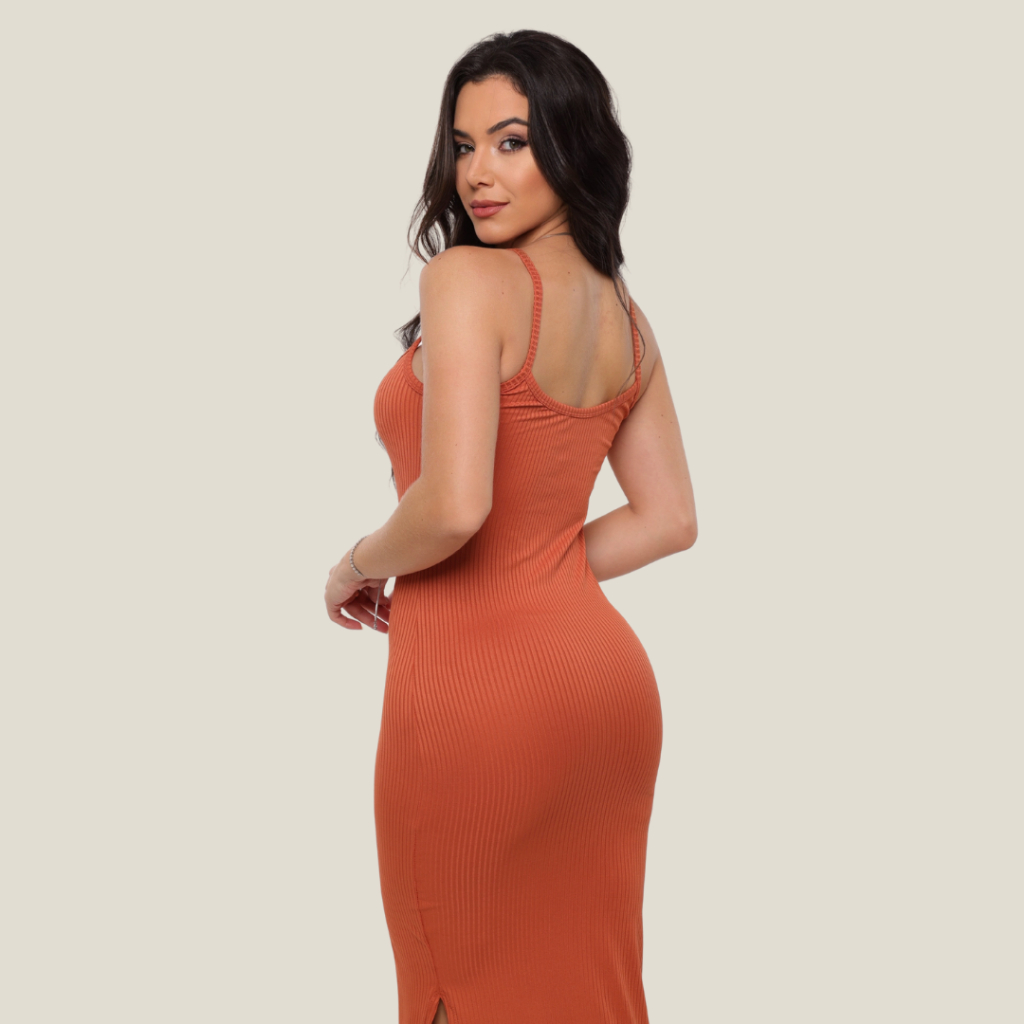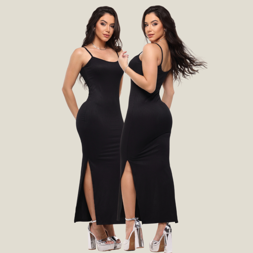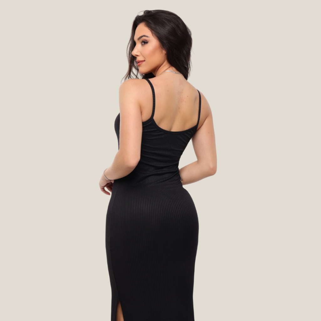 Vestido Longo Canelado Slim com Fenda Lateral e Alça Fina Decote Quadrado Sem Bojo