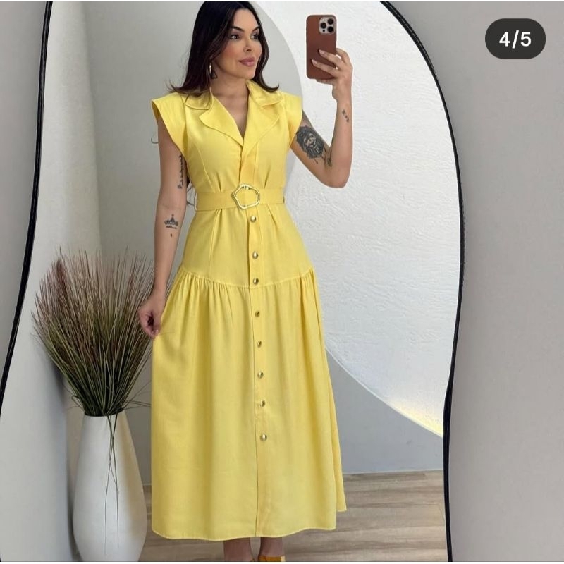 Vestido feminino com cinto / Com bojo / Com botões na frente / Tendência