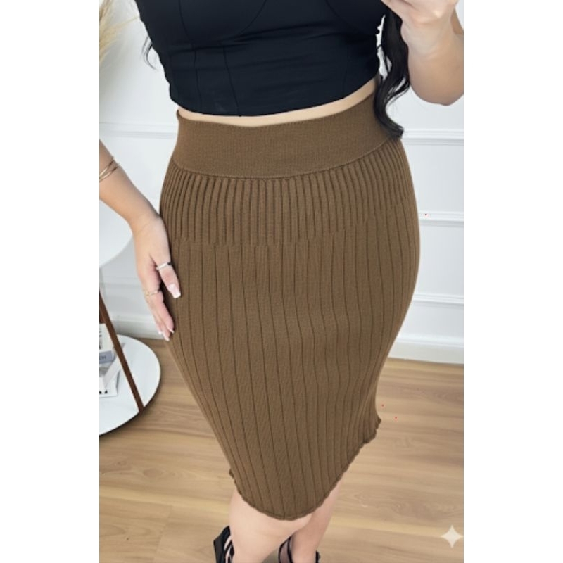 Saia midi canelada tricot modal elegante moderna versátil Casual Escritório inverno e verão